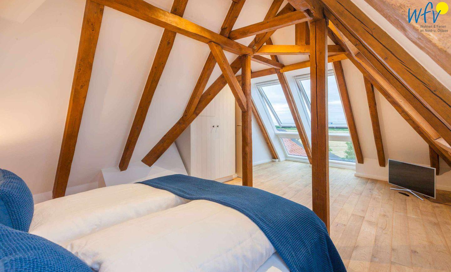 Auf der zweiten Etage der Ferienwohnung "Kleine Töwerliebe" auf Juist befindet sich das separate Schlafzimmer mit bequemem Doppelbett (180 x 200 cm). Freigelegte Holzbalken verleihen dem Raum eine sehr gemütliche Atmosphäre. Zudem erwartet Sie ein einzigartiger Ausblick auf Juists malerische Naturlandschaft!