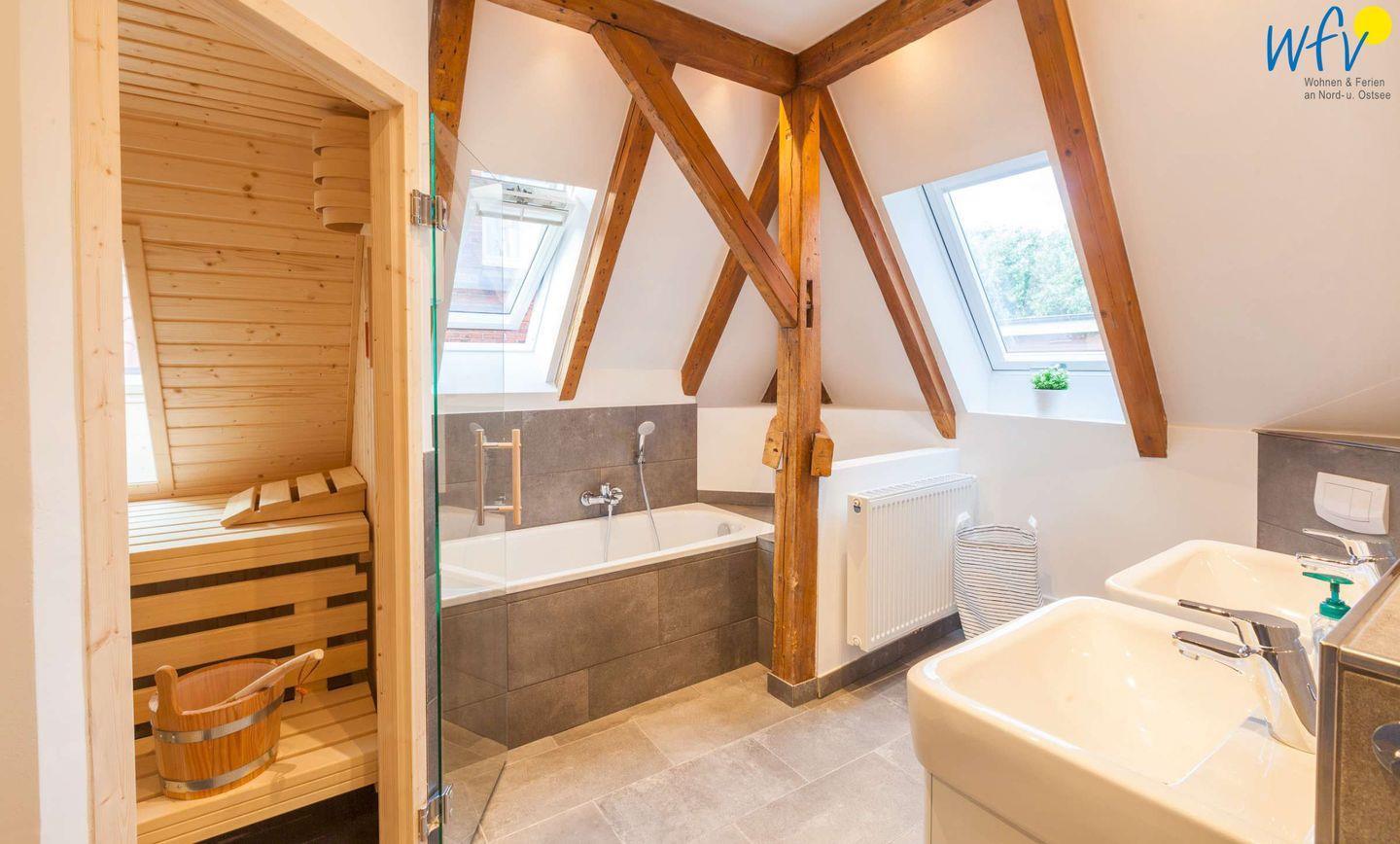 Herrlich relaxen können Sie außerdem in dem komfortablen Badezimmer mit Saunabereich. Hier lässt sich der Strandtag wunderbar mit einem wohltuenden Saunagang oder einem heißen Schaumbad ausklingen! Zusätzlich zum Hauptbad ist in der Ferienwohnung ein Gäste-WC vorhanden.
