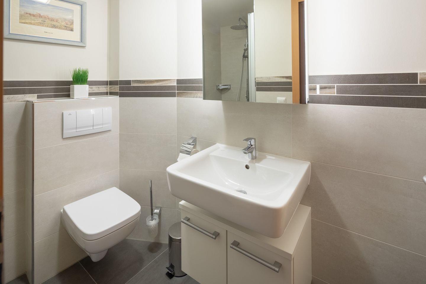 Das Badezimmer ist modern und funktional eingerichtet und verfügt über eine Dusche, ein WC, ein Waschbecken sowie einen Haartrockner. Handtücher, Badetücher und Bettwäsche sind inklusive und garantieren höchsten Komfort während Ihres Aufenthalts.