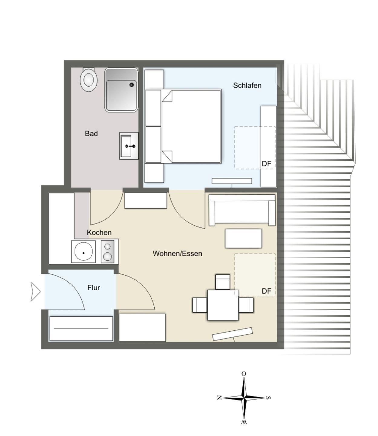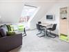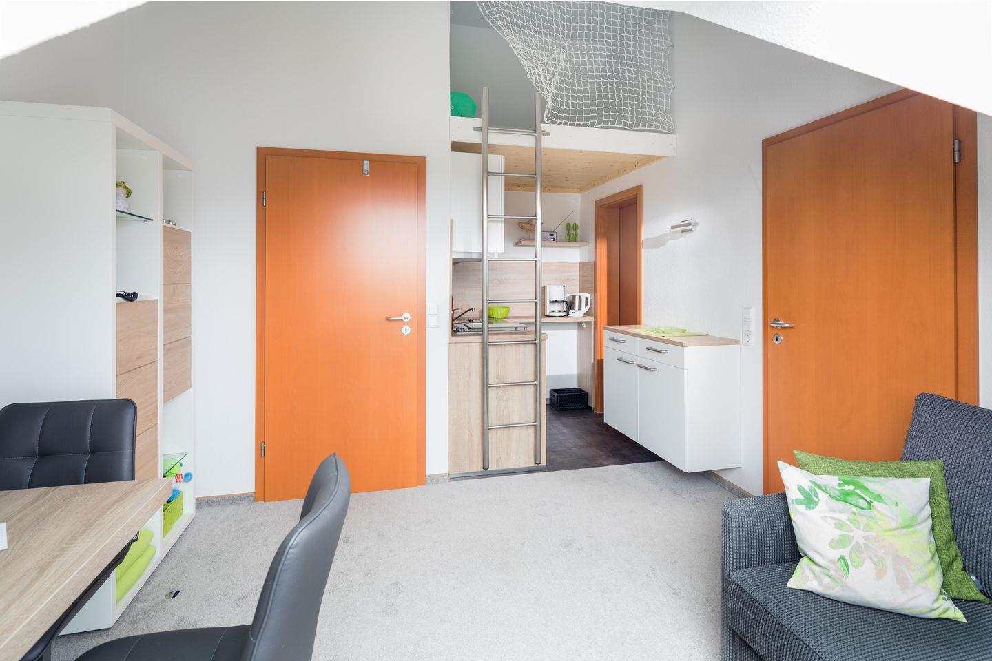 Mit einer Fläche von 32 m² und einem geschmackvollen, modernen Design ist die "Zauberspitze" ideal ausgestattet für Ihren Aufenthalt. Die Wohnung verfügt über ein eingerichtetes Wohnzimmer mit einer Schlafcouch, die zum Entspannen nach einem erlebnisreichen Tag einlädt. Ein Esstisch sorgt dafür, dass auch gemeinsame Mahlzeiten in gemütlicher Atmosphäre genossen werden können. Über eine Treppe können Kinder in eine Schlafhöhle gelangen, die mit einer Doppelmatratze ausgesattet ist.