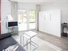 Die Wohnung verfügt über einen Wohn- und Schlafbereich mit einem ausklappbaren Schrankbett. Hier kann tagsüber das Bett hochgeklappt werden, so dass man genug Platz zum verweilen hat. Die Küche ist ausgestattet mit einem 2-Platten-Herd, Kühlschrank, Toaster, Wasserkocher und einer Filterkaffeemaschine.
