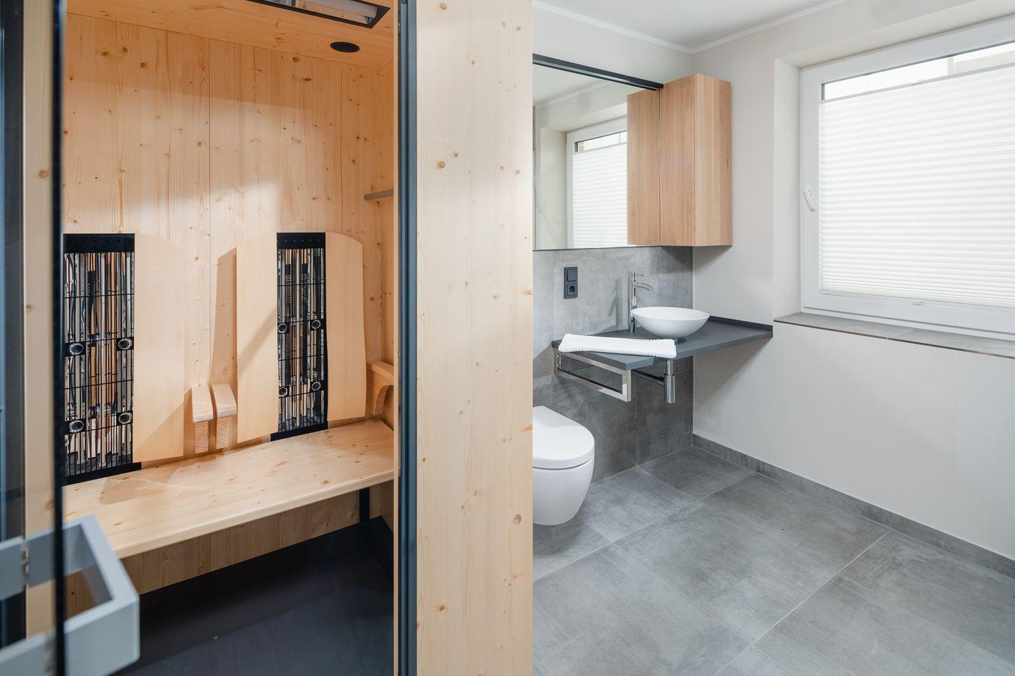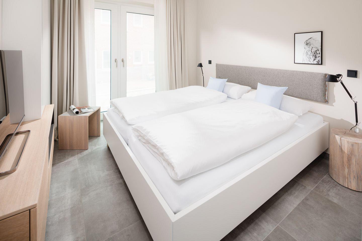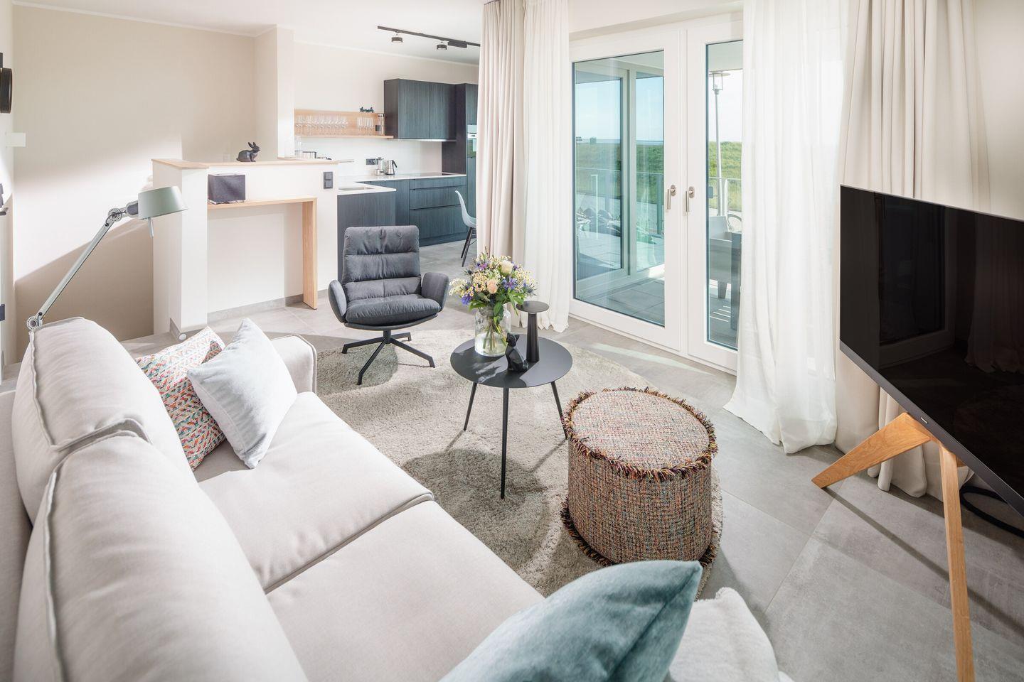 Über zwei Ebenen auf insgesamt 99 qm erstreckt sich diese einzigartige Wohneinheit, die ein Höchstmaß an Komfort bietet und beim Eintreten den Blick Richtung Süden lenkt. Das Erdgeschoss verfügt über einen Koch-/Wohnbereich mit direktem Zugang zur Terrasse. Bodentiefe Fenster sorgen für ein lichtdurchflutetes Ambiente. Die wunderschönen Details dieser Ferienwohnung mit ihrer hochwertigen Ausstattung werden sie begeistern. Neben zwei Schlafzimmern mit Doppelbetten und zwei Duschbädern gehören eine Infrarot-Sauna und ein ausgefallener, kleiner Fitnessraum zur gehobenen Ausstattung.