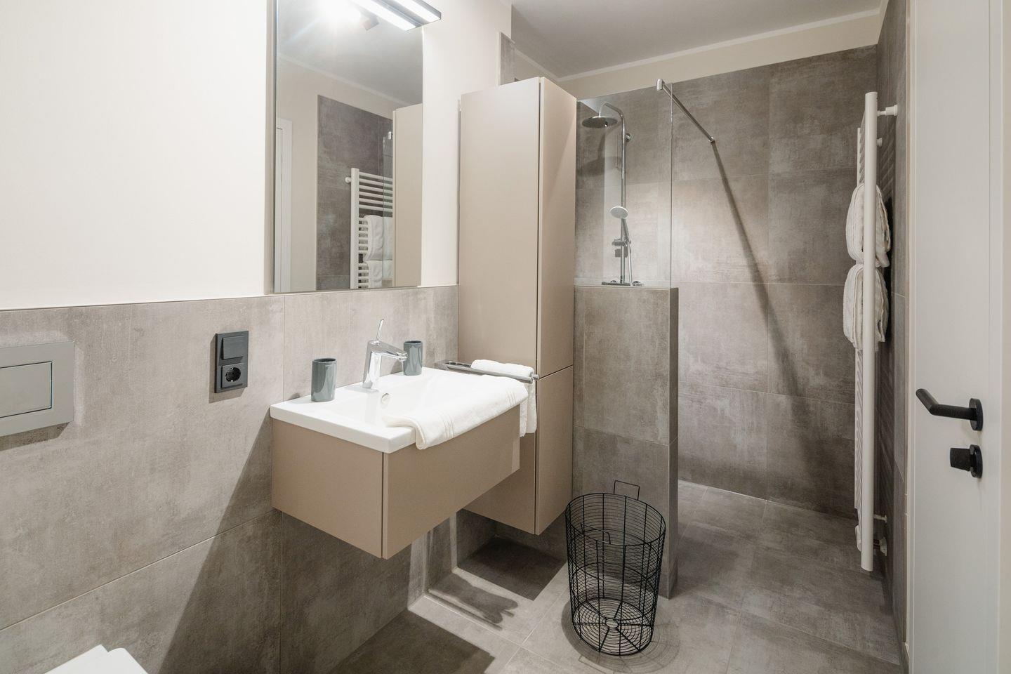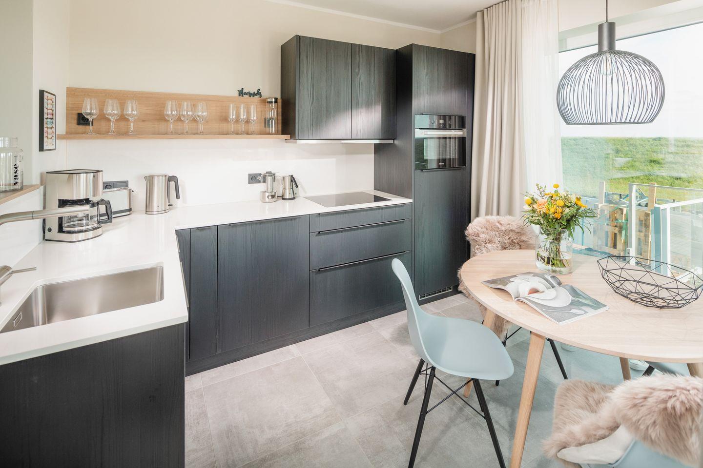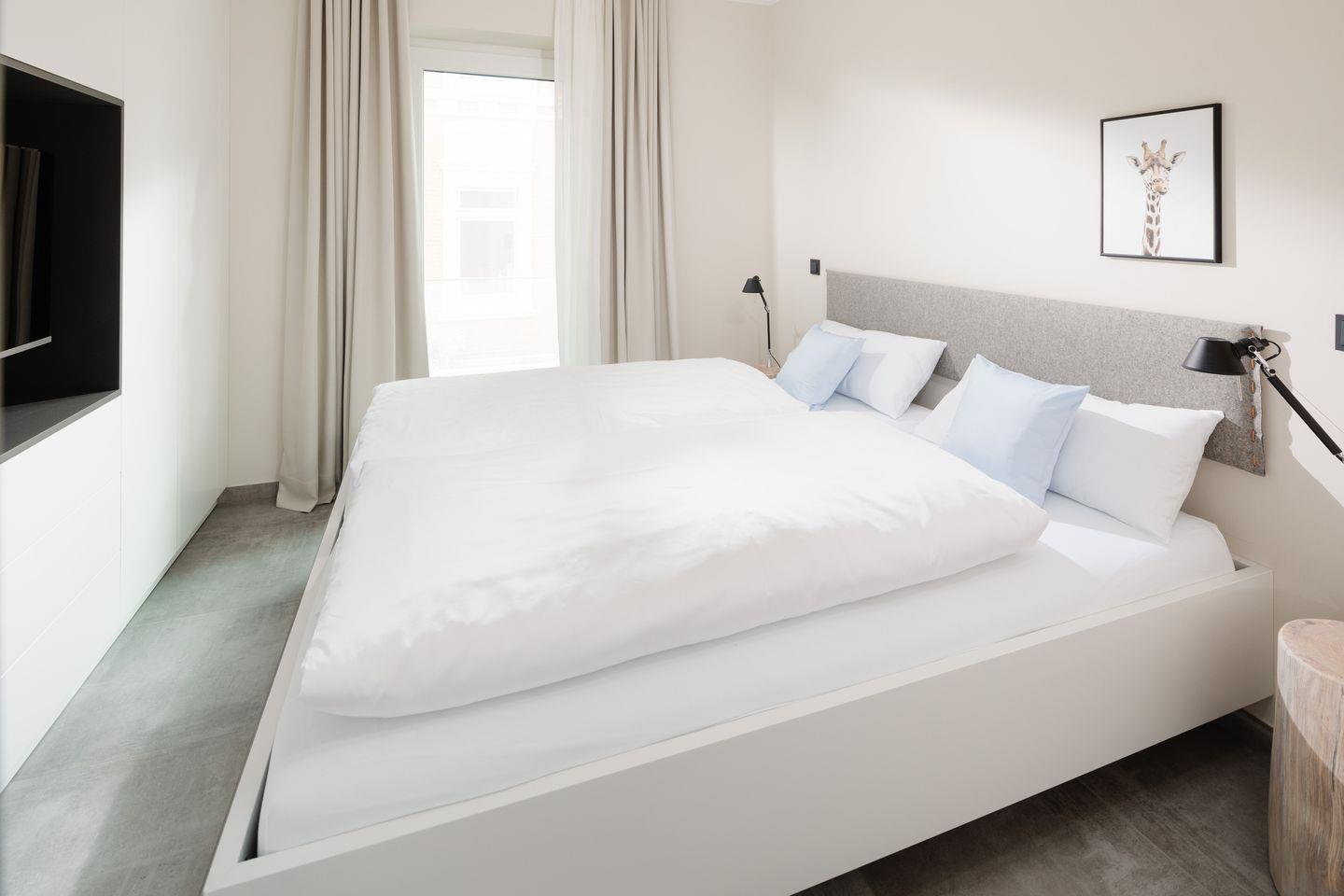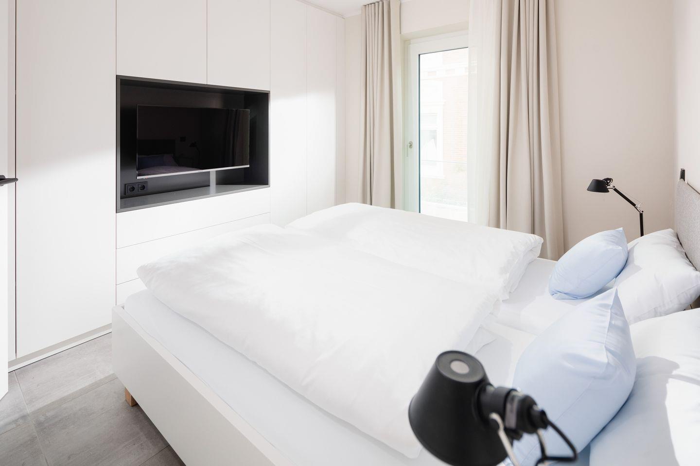 Über zwei Ebenen auf insgesamt 99 qm erstreckt sich diese einzigartige Wohneinheit, die ein Höchstmaß an Komfort bietet und beim Eintreten den Blick Richtung Süden lenkt. Das Erdgeschoss verfügt über einen Koch-/Wohnbereich mit direktem Zugang zur Terrasse. Bodentiefe Fenster sorgen für ein lichtdurchflutetes Ambiente. Die wunderschönen Details dieser Ferienwohnung mit ihrer hochwertigen Ausstattung werden sie begeistern. Neben zwei Schlafzimmern mit Doppelbetten und zwei Duschbädern gehören eine Infrarot-Sauna und ein ausgefallener, kleiner Fitnessraum zur gehobenen Ausstattung.