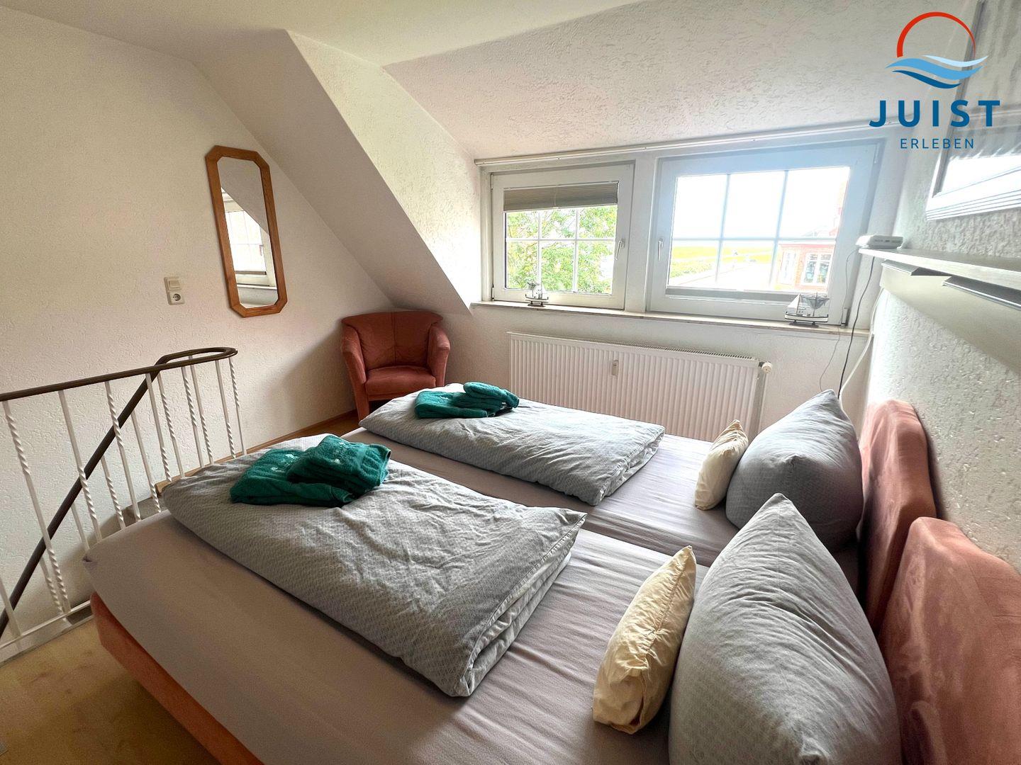 Über eine schmale Treppe gelangen Sie ins offene Obergeschoss, wo sich das Schlafzimmer mit komfortablem Doppelbett viel Staubmöglichkeiten und einem Wattenmeerausblick befindet – ein ruhiger Ort zum Träumen und Entspannen.