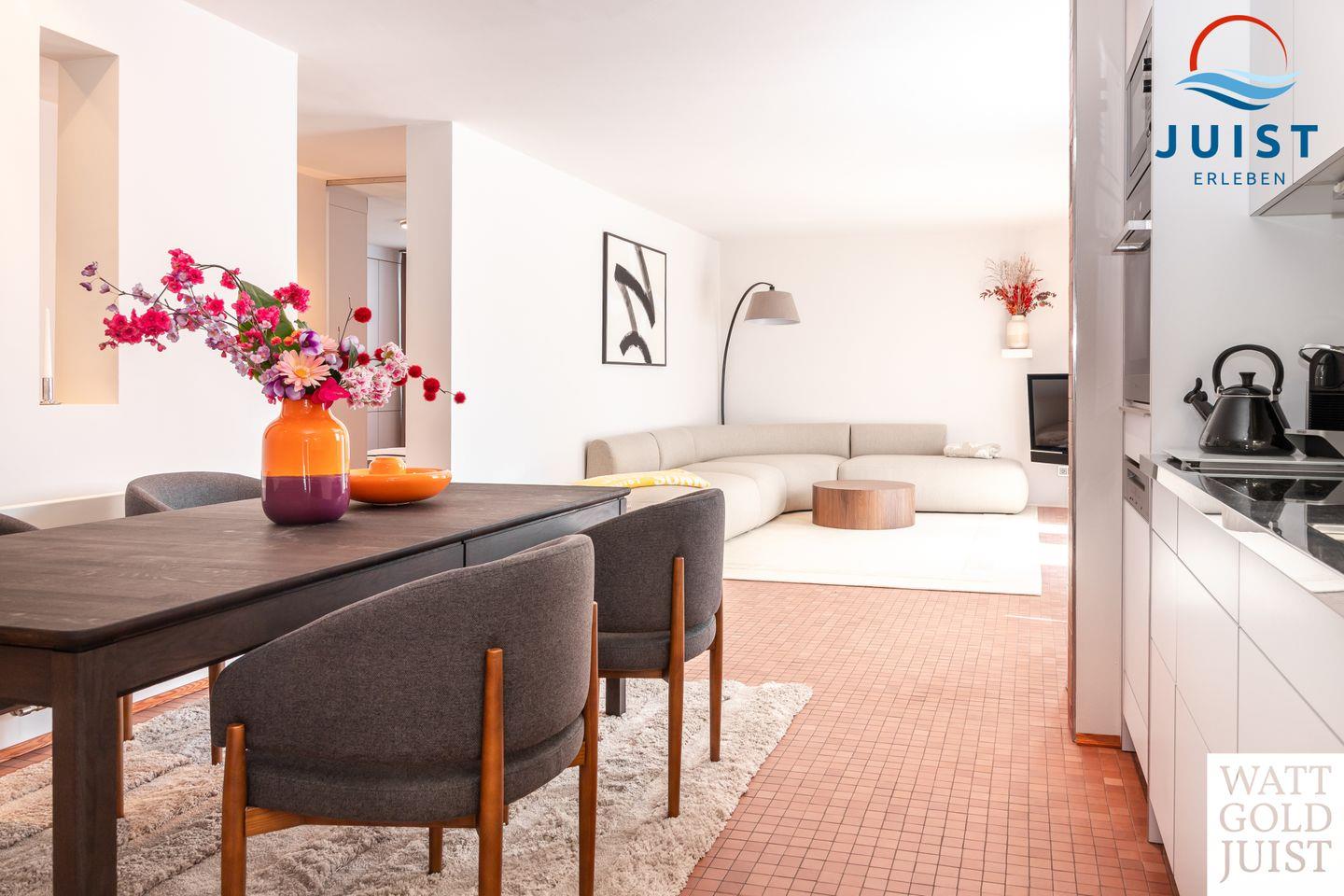 Die weitläufige Wohnung empfängt Sie mit einem stilvollen Wohn- und Essbereich, der von einer exquisit ausgestatteten Premiumküche ergänzt wird.
