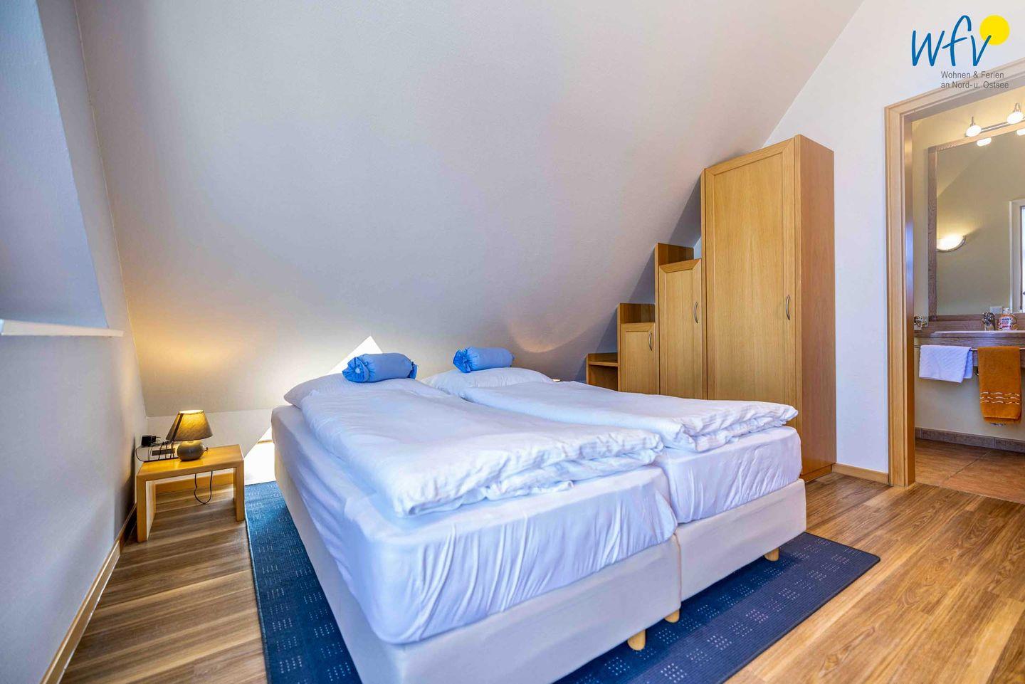 Die beiden separaten Schlafzimmer sind jeweils mit einem komfortablen Doppelbett ausgestattet. Geräumige Kleiderschränke bieten Platz für Ihre Urlaubsgarderobe.