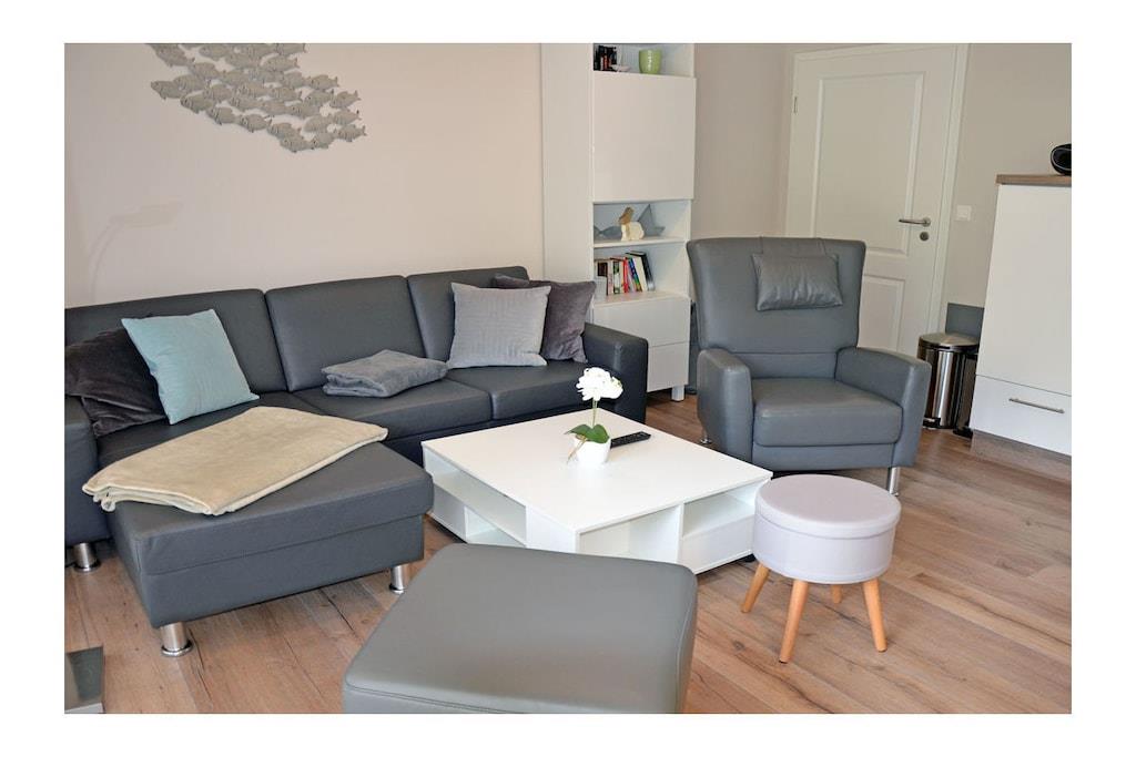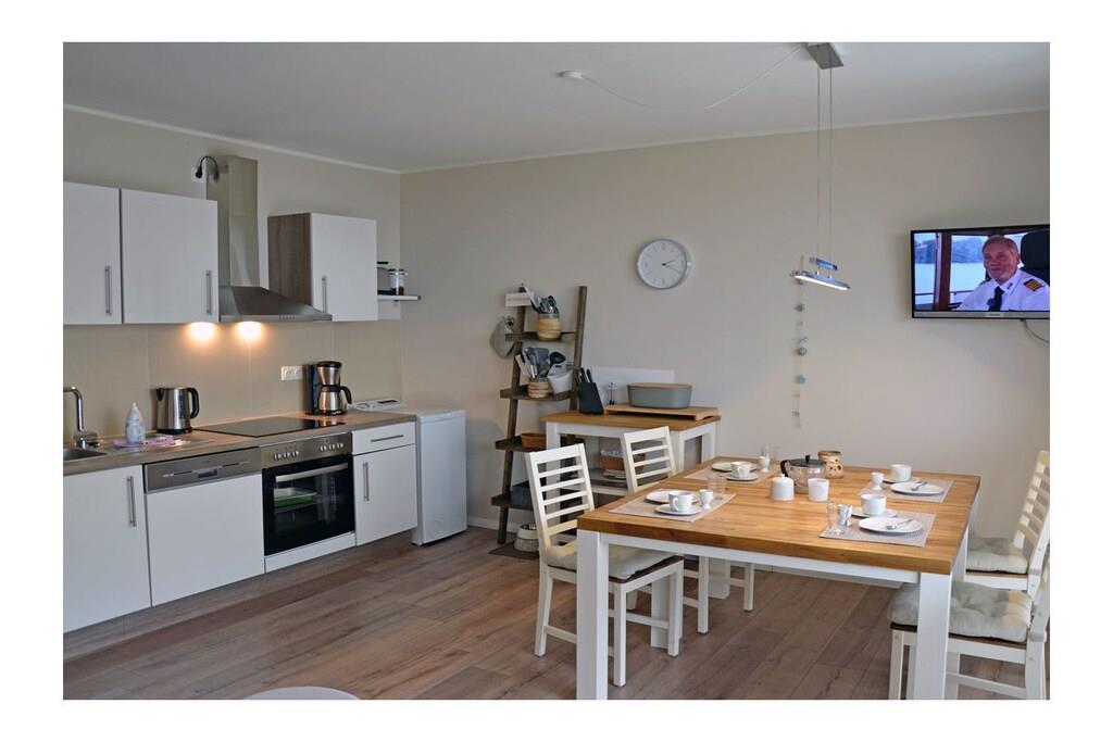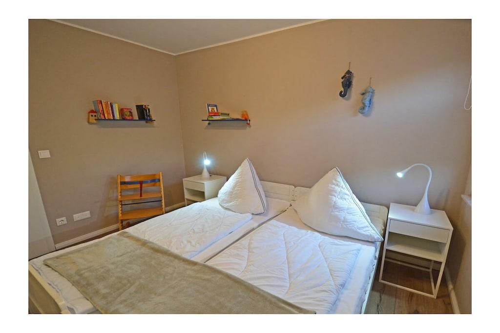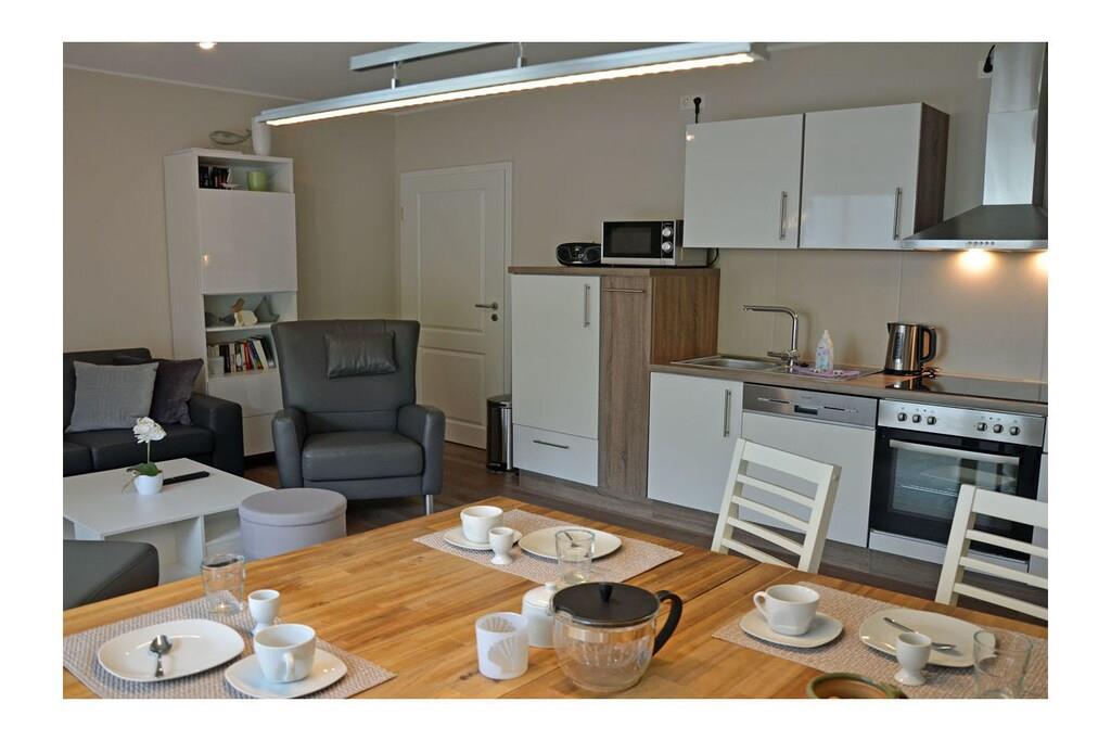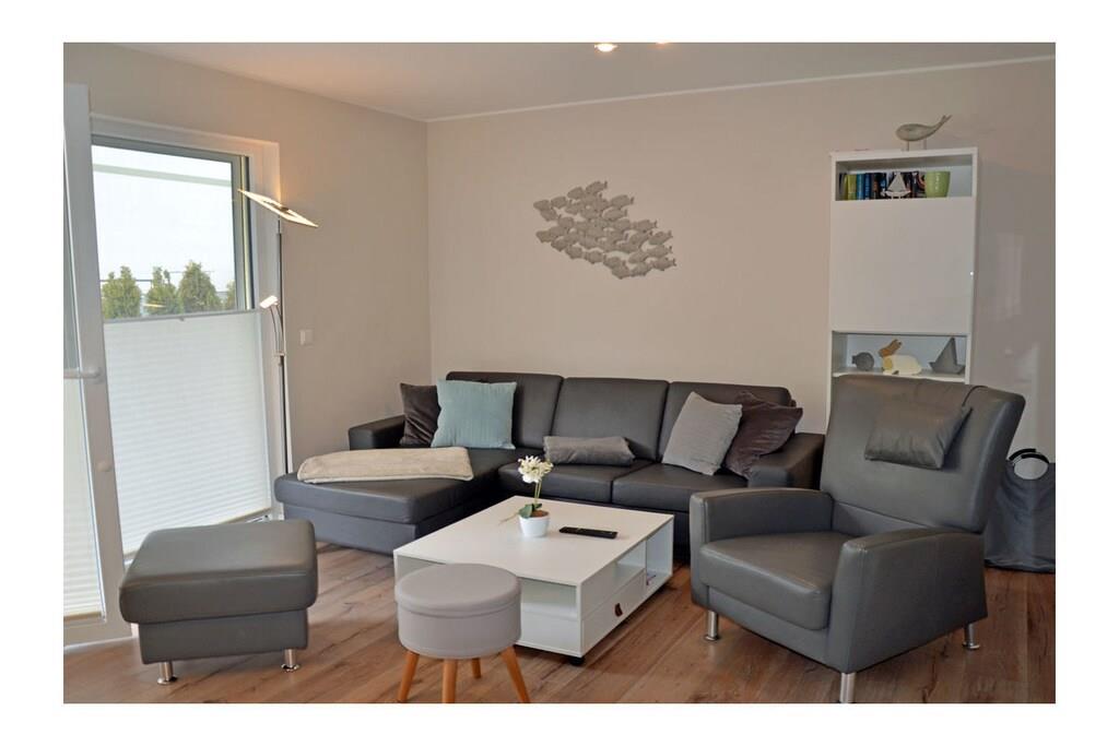 Parterre: großzügiger Wohn- Essbereich, gemütliche Couchlandschaft, TV/ Sat (Smart-TV Flatscreen), Radio/CD, Internet (WLAN), Bücher und Gesellschaftsspiele für gemütliche Abende, Fliegenschutzgitter im Wohnzimmer und in den Schlafräumen, offene komplett ausgestattete Einbauküche mit hochwertigen Geräten, Filter-und Kapselkaffeemaschine (Tchibo Cafissimo pure+) 4- Plattenherd (Ceranfeld), Backofen, Kühlschrank mit kleinem Gefrierfach, Geschirrspüler, Mikrowelle und diversen Elektrogeräten, Waschmaschine in der Küche vorhanden, großes Bad mit ebenerdiger Dusche und WC 1. Schlafzimmer mit Doppelbett (2 Matratzen je 90x200), TV/Sat (Flatscreen) und Kleiderschrank, 2. Schlafzimmer mit einem Doppelbett (zwei Einzelbetten mit je einer Matratze 90x200) und Kleiderschrank Außenbereich: große Terrasse (20 m²) mit Strandkorb, Tisch und Gartenstühle, Sonnenschirm vorhanden, Grillmöglichkeit besteht (Gemeinschaftsgrill)