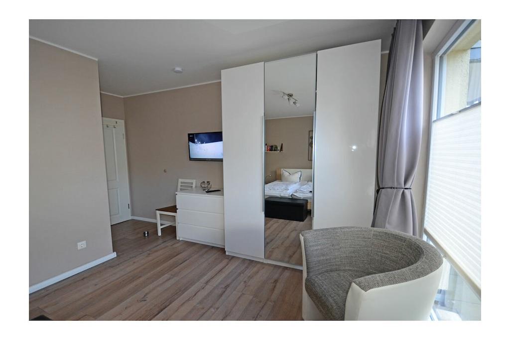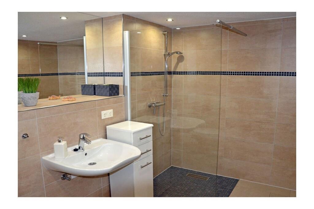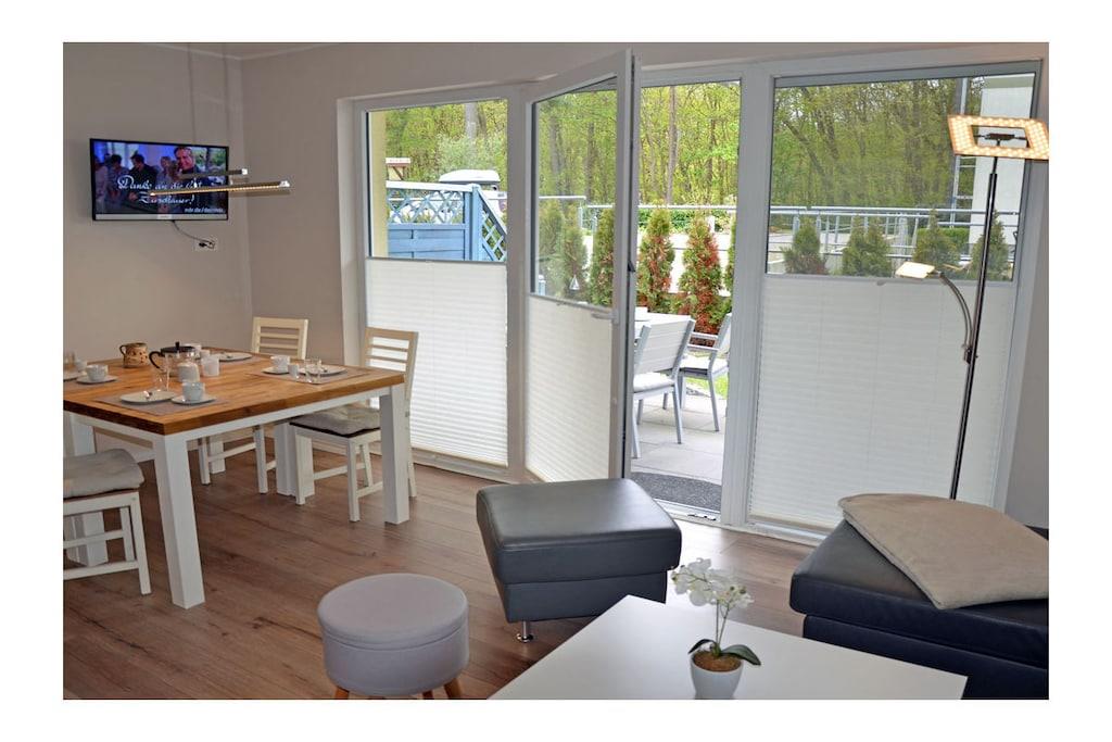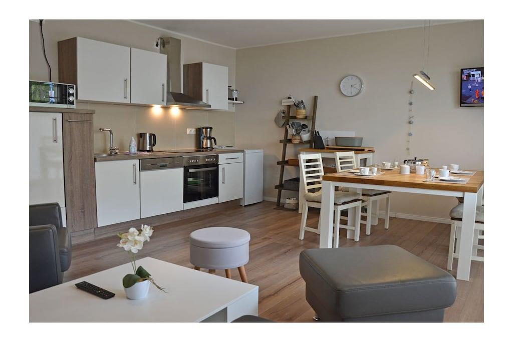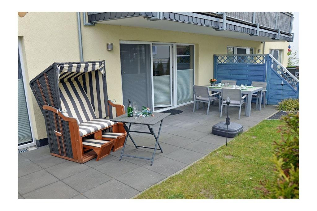 Parterre: großzügiger Wohn- Essbereich, gemütliche Couchlandschaft, TV/ Sat (Smart-TV Flatscreen), Radio/CD, Internet (WLAN), Bücher und Gesellschaftsspiele für gemütliche Abende, Fliegenschutzgitter im Wohnzimmer und in den Schlafräumen, offene komplett ausgestattete Einbauküche mit hochwertigen Geräten, Filter-und Kapselkaffeemaschine (Tchibo Cafissimo pure+) 4- Plattenherd (Ceranfeld), Backofen, Kühlschrank mit kleinem Gefrierfach, Geschirrspüler, Mikrowelle und diversen Elektrogeräten, Waschmaschine in der Küche vorhanden, großes Bad mit ebenerdiger Dusche und WC 1. Schlafzimmer mit Doppelbett (2 Matratzen je 90x200), TV/Sat (Flatscreen) und Kleiderschrank, 2. Schlafzimmer mit einem Doppelbett (zwei Einzelbetten mit je einer Matratze 90x200) und Kleiderschrank Außenbereich: große Terrasse (20 m²) mit Strandkorb, Tisch und Gartenstühle, Sonnenschirm vorhanden, Grillmöglichkeit besteht (Gemeinschaftsgrill)