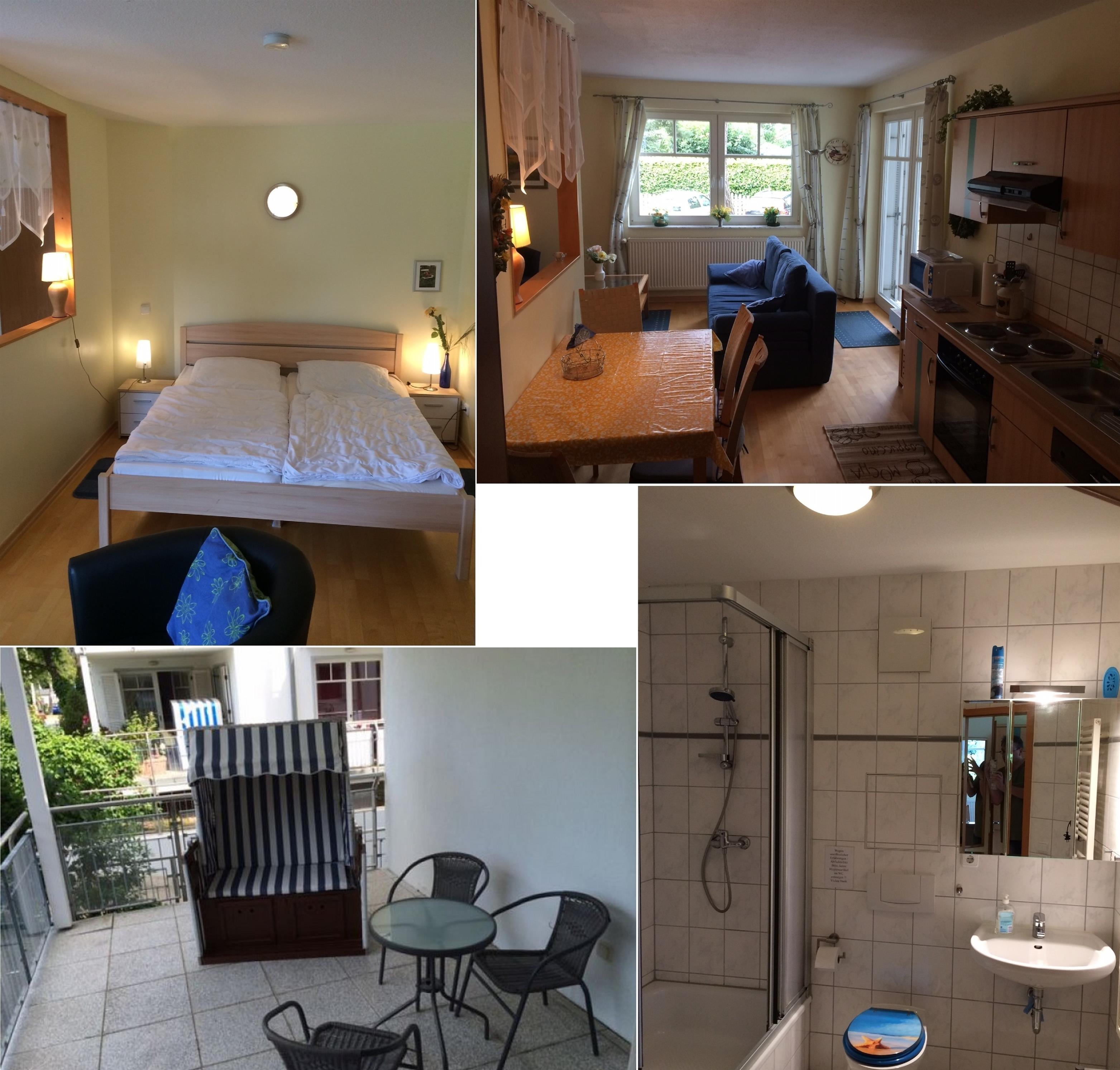 Es stehen Ihnen 2 Wohn/Schlafzimmer eines mit kompletter Küchenzeile, ein Schlafzimmer mit Doppelbett, zur Verfügung, sowie eine extra Kitchinette mit Essecke. 2 Badezimmer mit Dusche/WC und Spiegelschrank und Fön. Im Flur finden Sie die Garderobe und einen Abstellschrank.