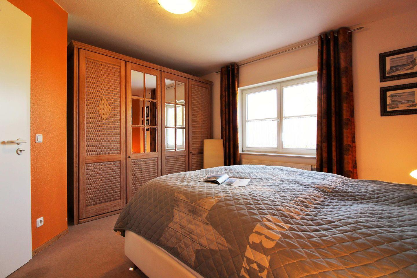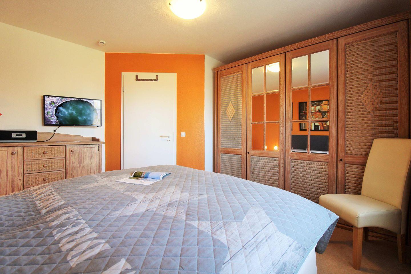 Das freundliche Schlafzimmer (mit Blick auf die nahe Ostsee und den Riedensee) ist mit einem bequemen Boxspring-Doppelbett, Nachttischen, einem geräumigen Kleiderschrank sowie einer Kommode eingerichtet. Zu Ihrer Unterhaltung steht Ihnen hier ein weiteres Flatscreen-TV-Gerät zur Verfügung.