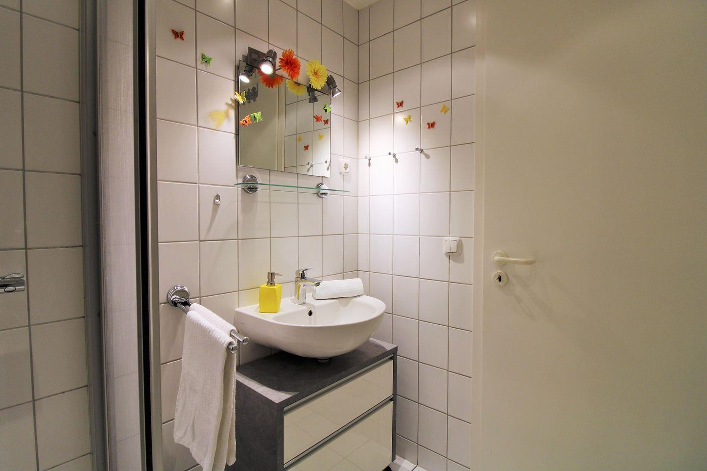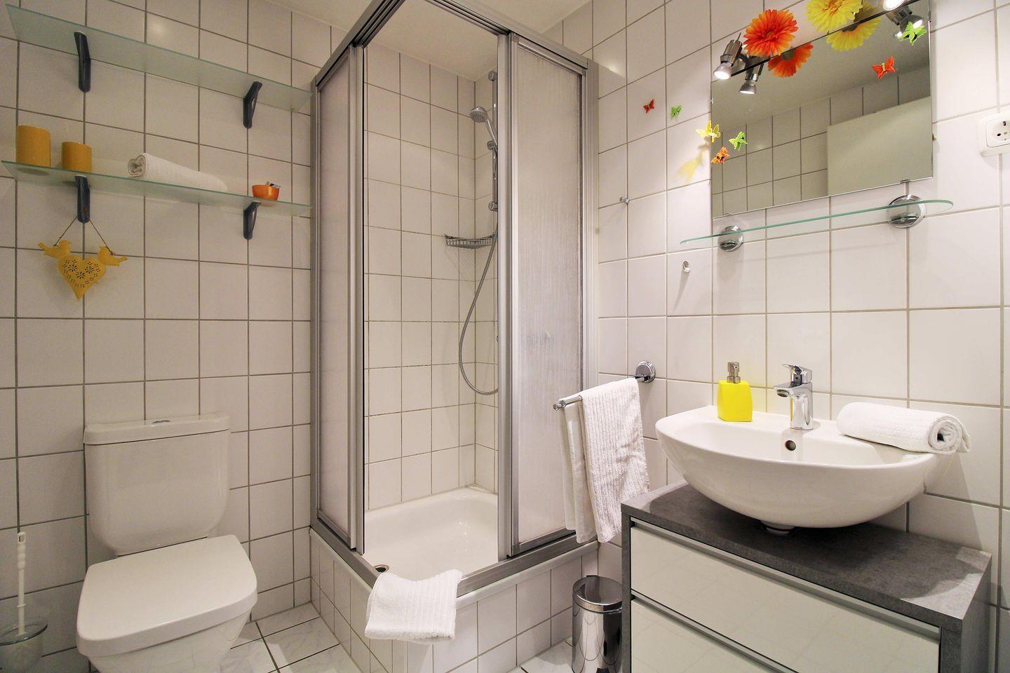 Das Badezimmer verfügt über eine Dusche, Waschbecken und WC, Fußbodenheizung sowie ausreichend Ablagemöglichkeiten.