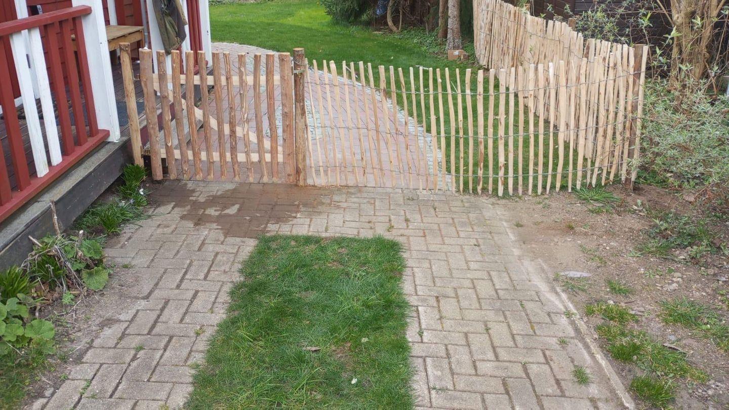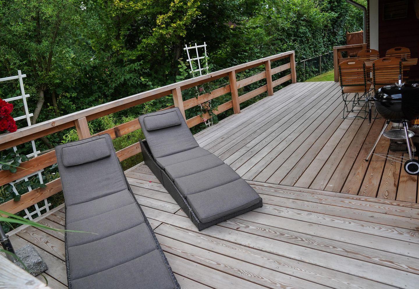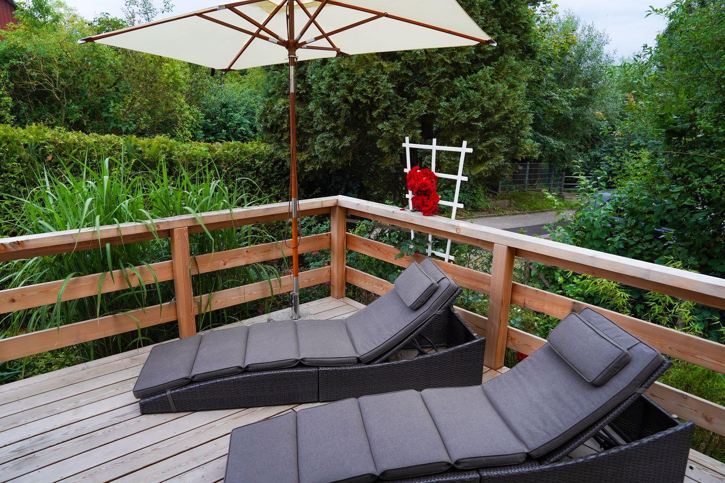 Nach Ihrem Saunagang lädt die Außendusche zur Abkühlung ein. Anschließend können Sie auf der rund 35 qm großen und teilüberdachten Terrasse entspannen und den Blick in die Natur genießen. Die Terrasse ist nicht nur mit bequemen Möbeln ausgestattet, sondern bietet als besonderes Highlight auch eine Hängematte, die zum Verweilen einlädt. Für gemütliche Grillabende steht Ihnen ein Grill der Firma Weber zur Verfügung. Der Garten ist komplett eingezäunt.