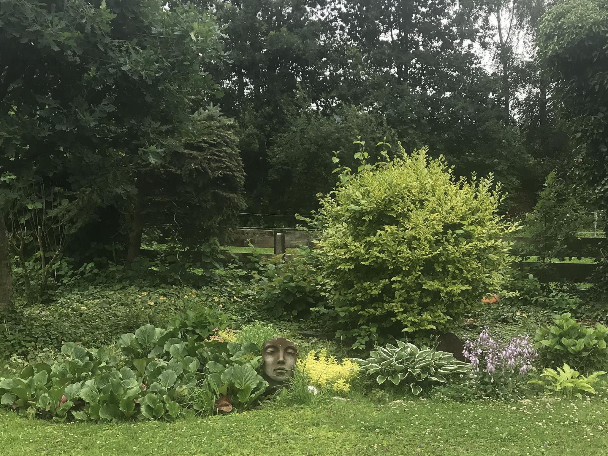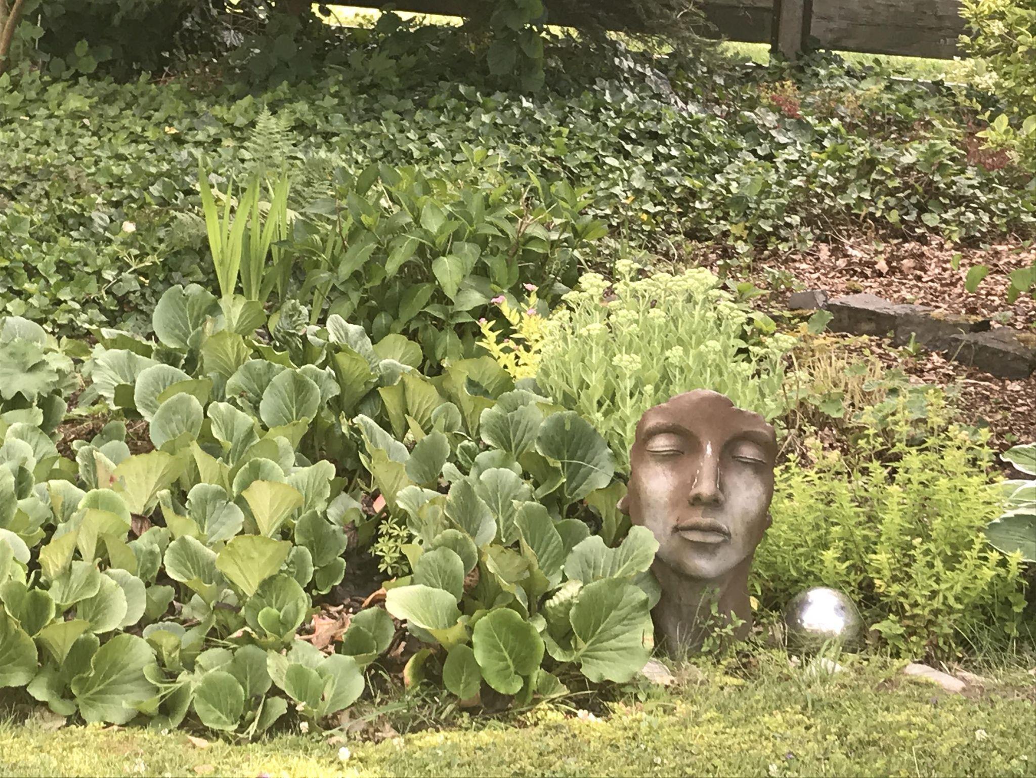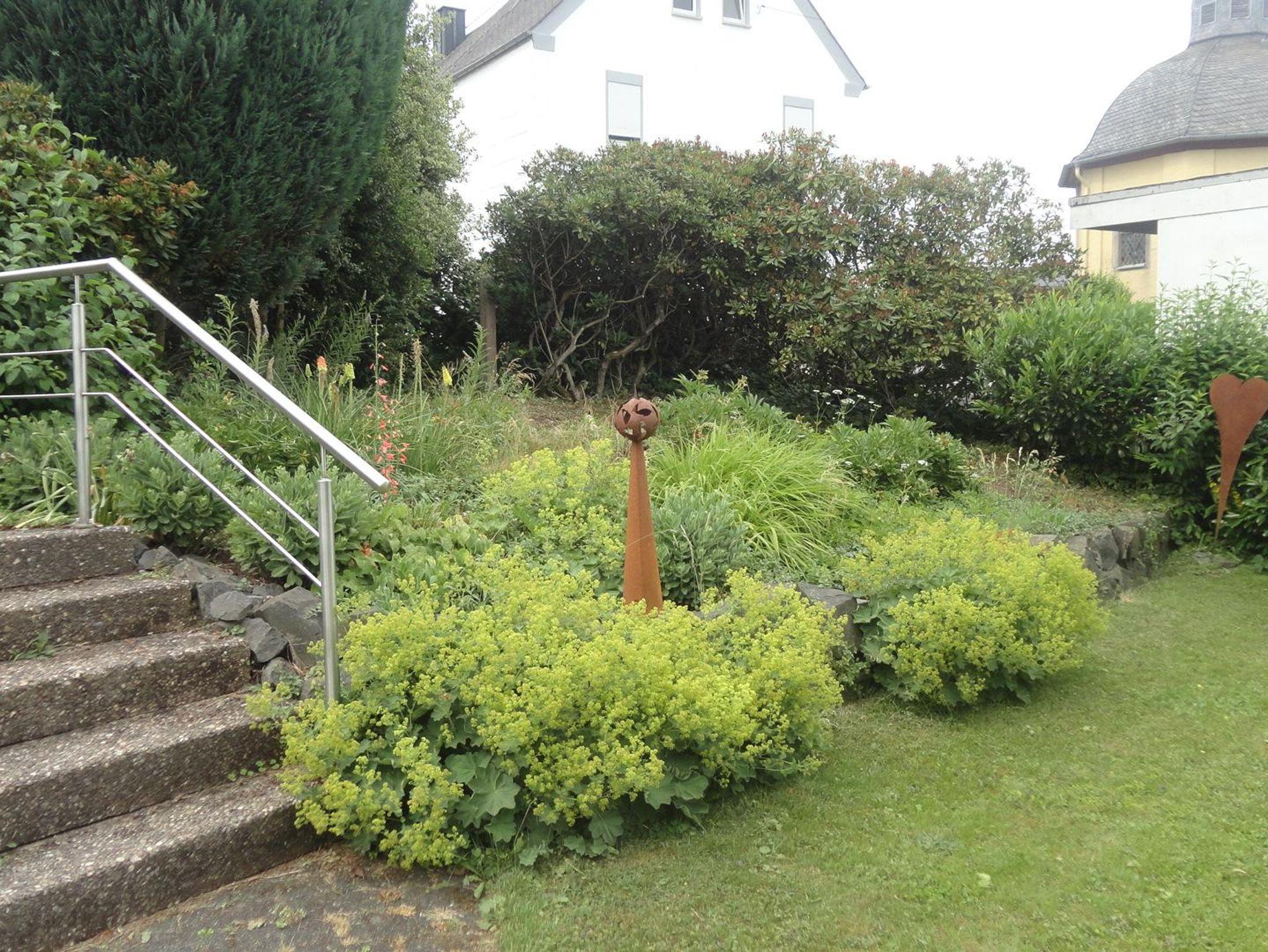 Von der Straße aus sind es sieben Stufen in den Garten, der Eingang liegt direkt im Garten.