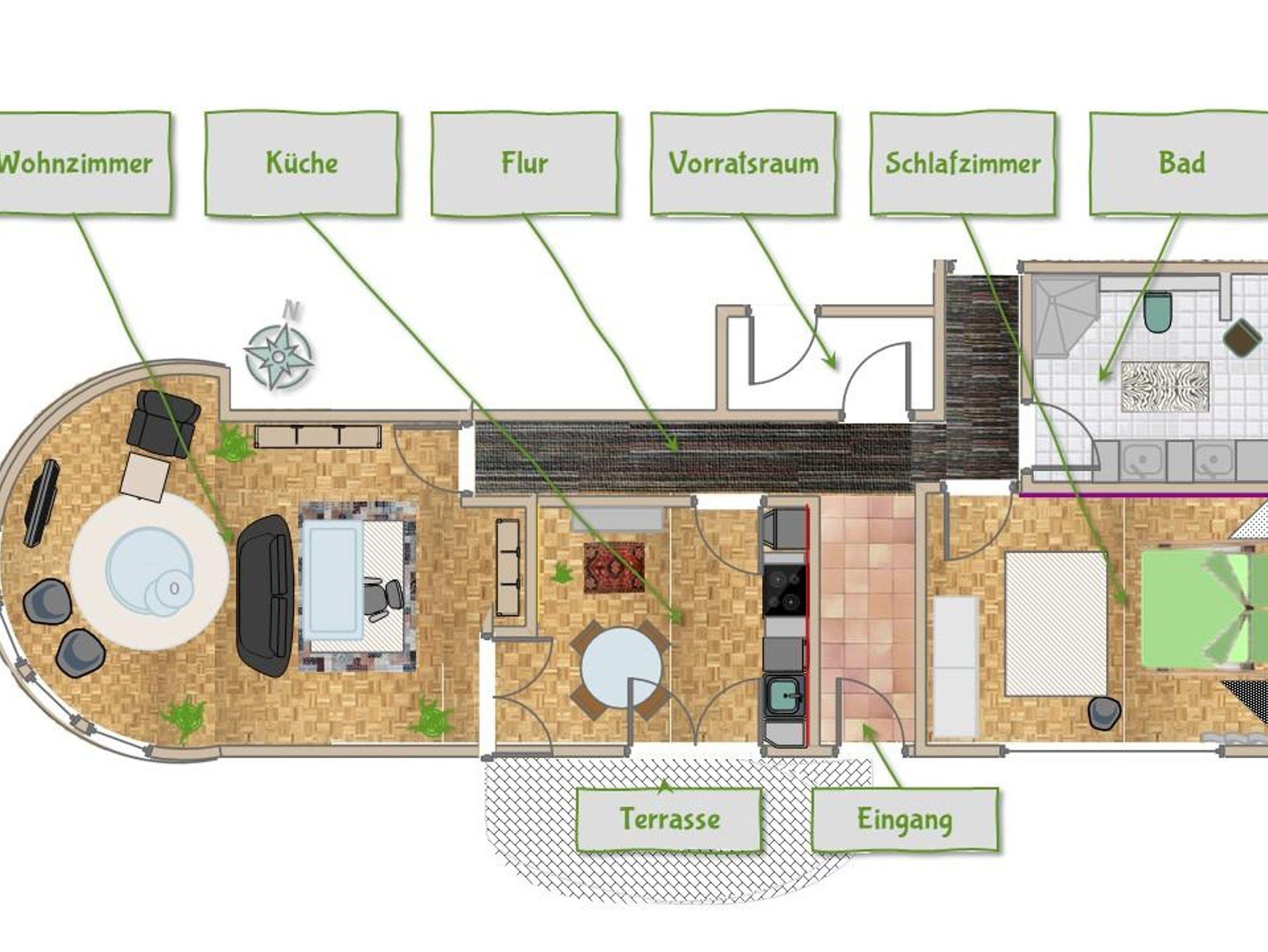 Die Wohnung ist komplett eingerichtet und ausgestattet. Zwei Zimmer, Küche, Bad.