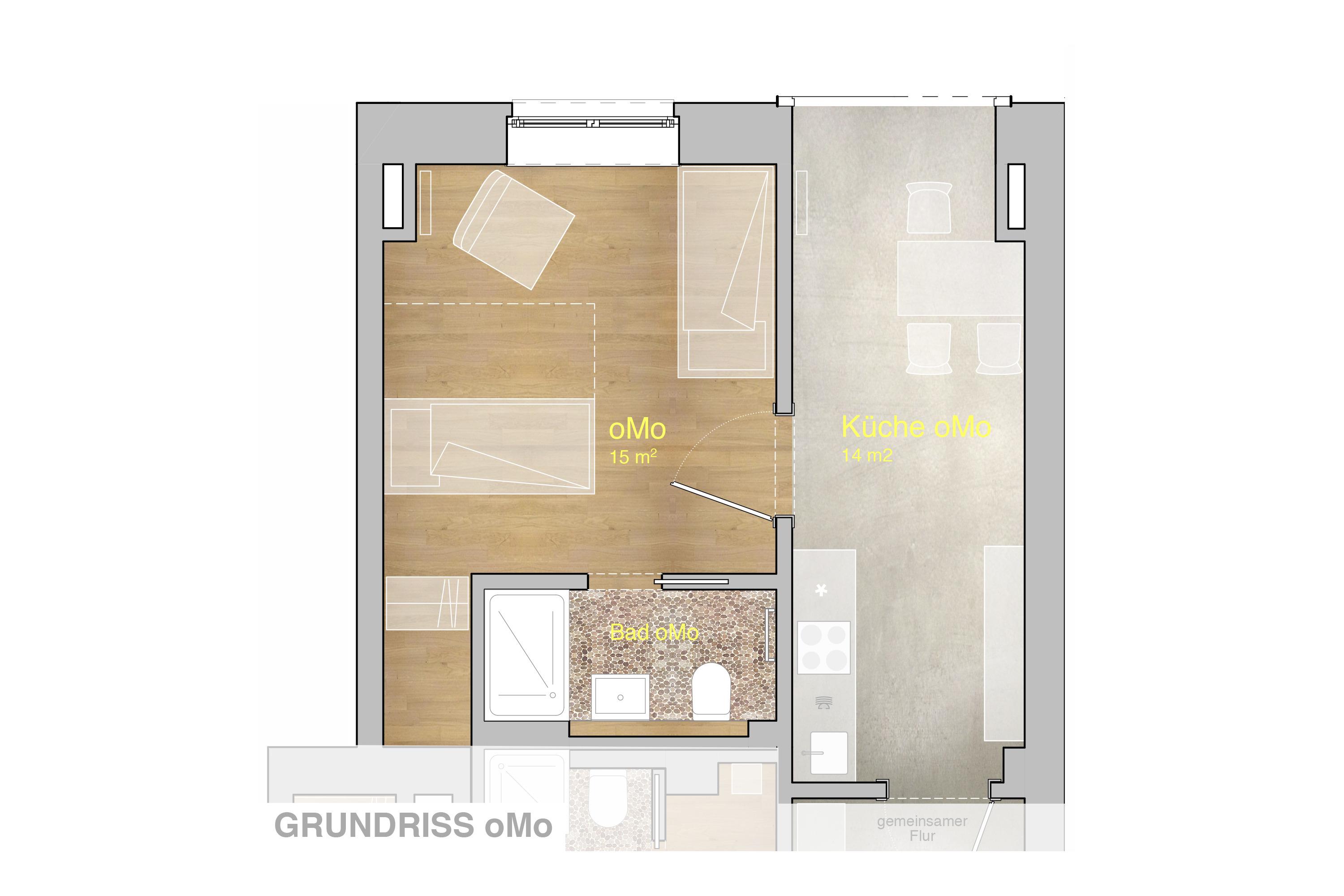 Das Appartement oMo hat hohe Decken und Fenster zum Hinterhof. Im Schlafzimmer liegt Parkett, im Bad Kieselfliesen und die Küche ist mit hellgrauem Sichtestrich gestaltet. Typisch für ein altes Stadthaus hat es Sprossenfenster mit moderner Doppelverglasung sowie überwiegend aufgearbeitete Originaltüren. Heizung und Handtuchtrockner im Bad sind modern. Die Einrichtung ist eine Mischung aus Familienschätzen und schlichten modernen Möbeln.