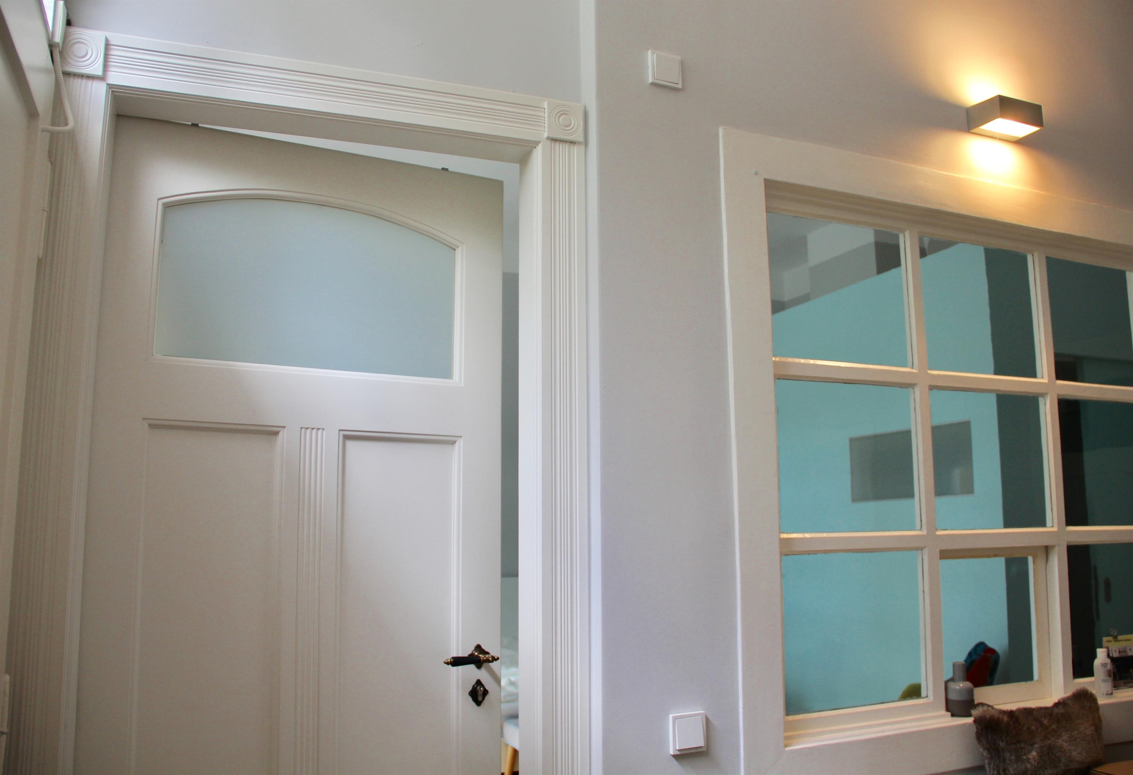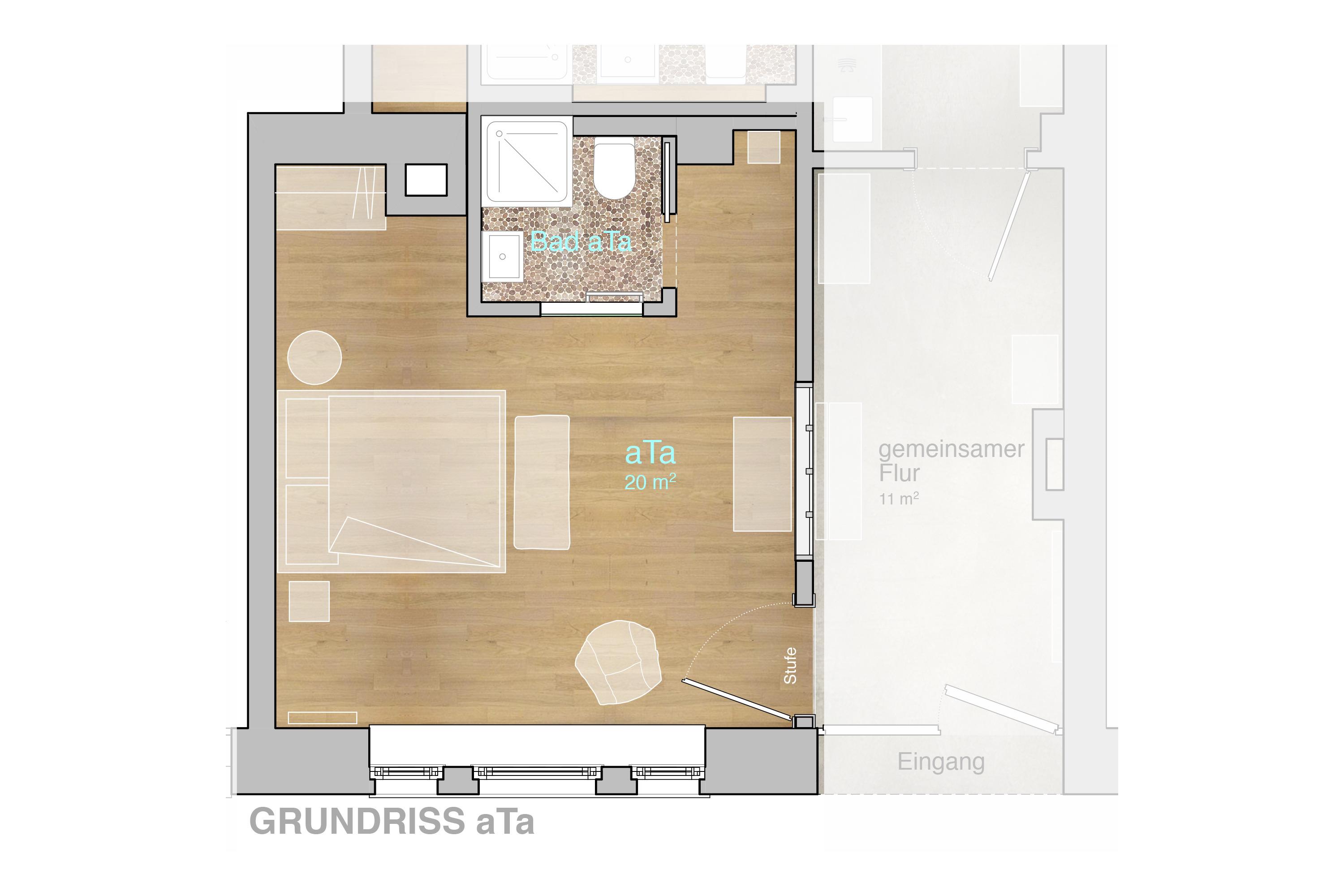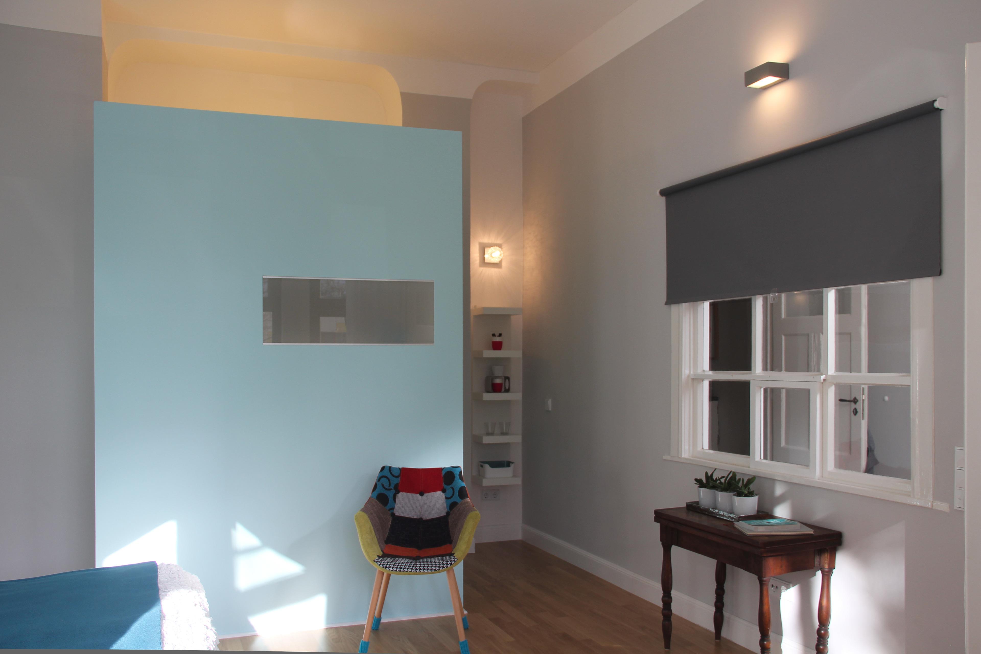 Das Doppelzimmer aTa hat hohe Decken und Fenster zur Straße. Im Schlafzimmer liegt Parkett, im Bad Kieselfliesen. Typisch für ein altes Stadthaus hat es Sprossenfenster mit moderner Doppelverglasung sowie überwiegend aufgearbeitete Originaltüren. Heizung und Handtuchtrockner im Bad sind modern. Die Einrichtung ist eine Mischung aus Familienschätzen und schlichten modernen Möbeln.