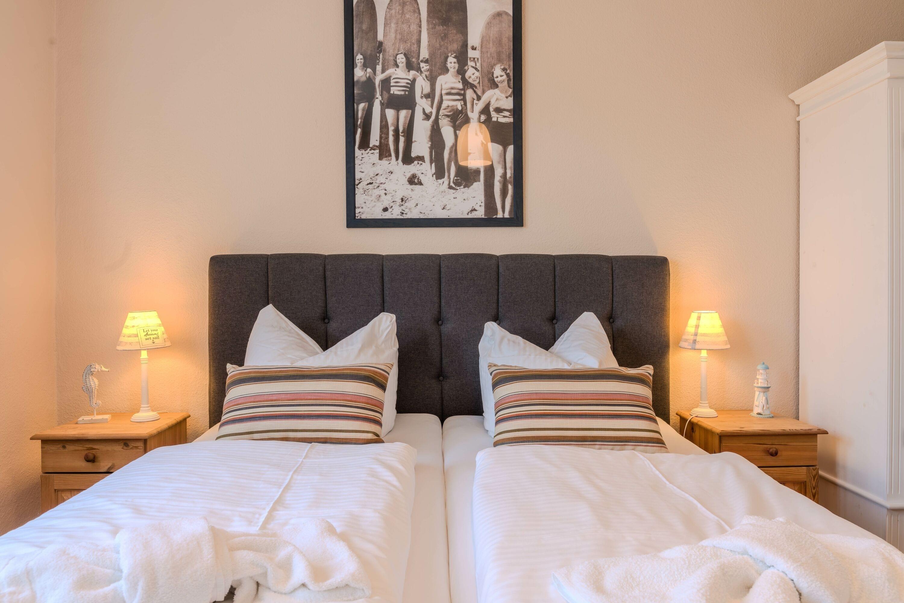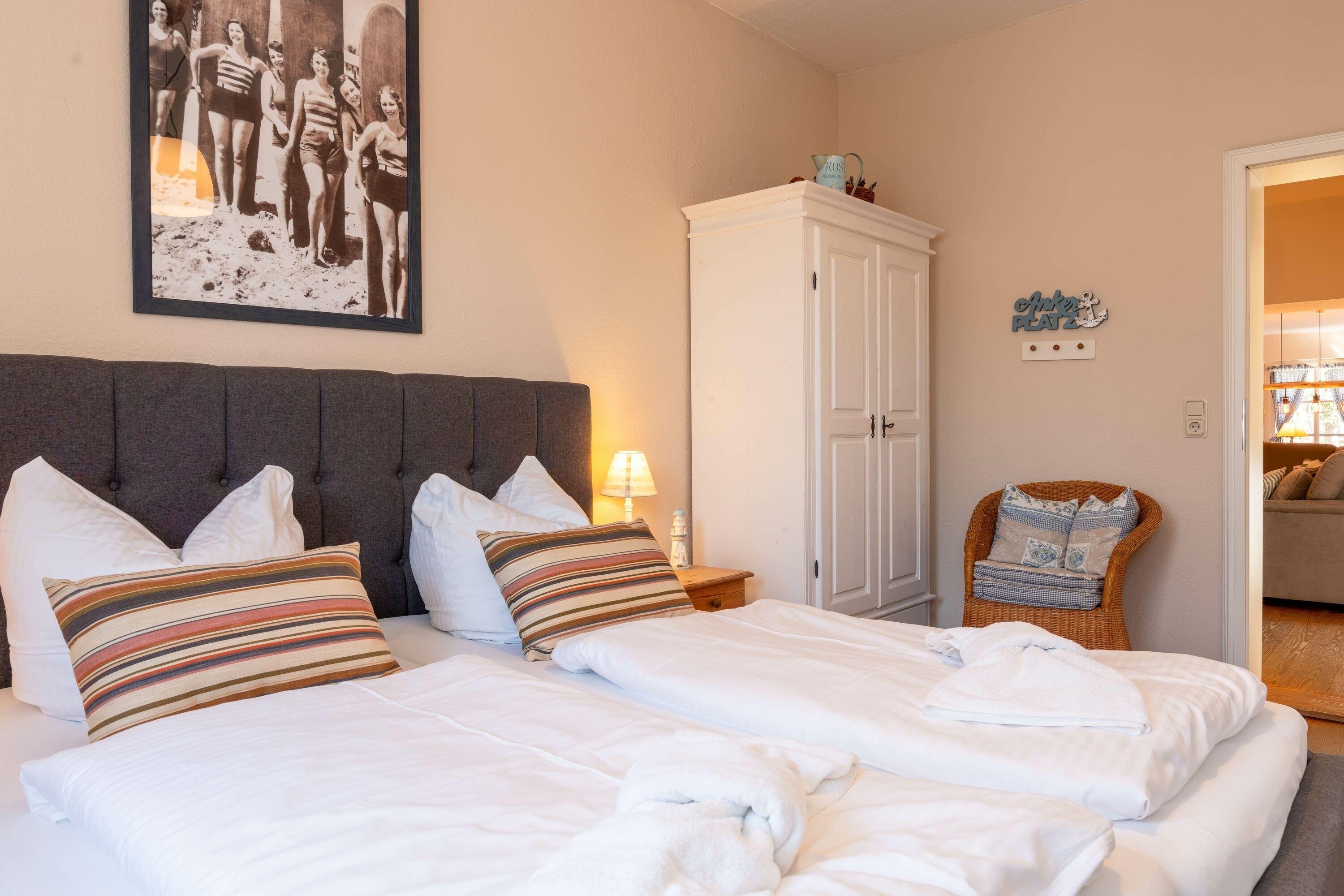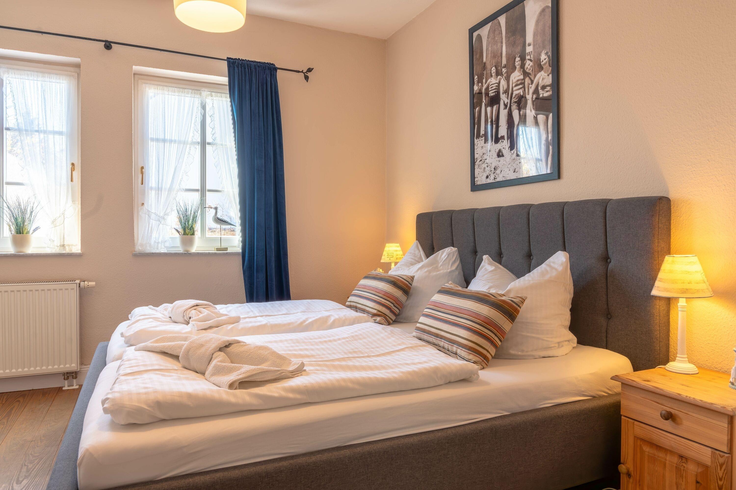Zwei liebevoll eingerichtete Schlafzimmer sorgen für erholsame Nächte. Das moderne Badezimmer verfügt über eine Dusche – perfekt, um sich nach einem Strandtag zu erfrischen. Bettwäsche und Handtücher sind selbstverständlich inklusive.