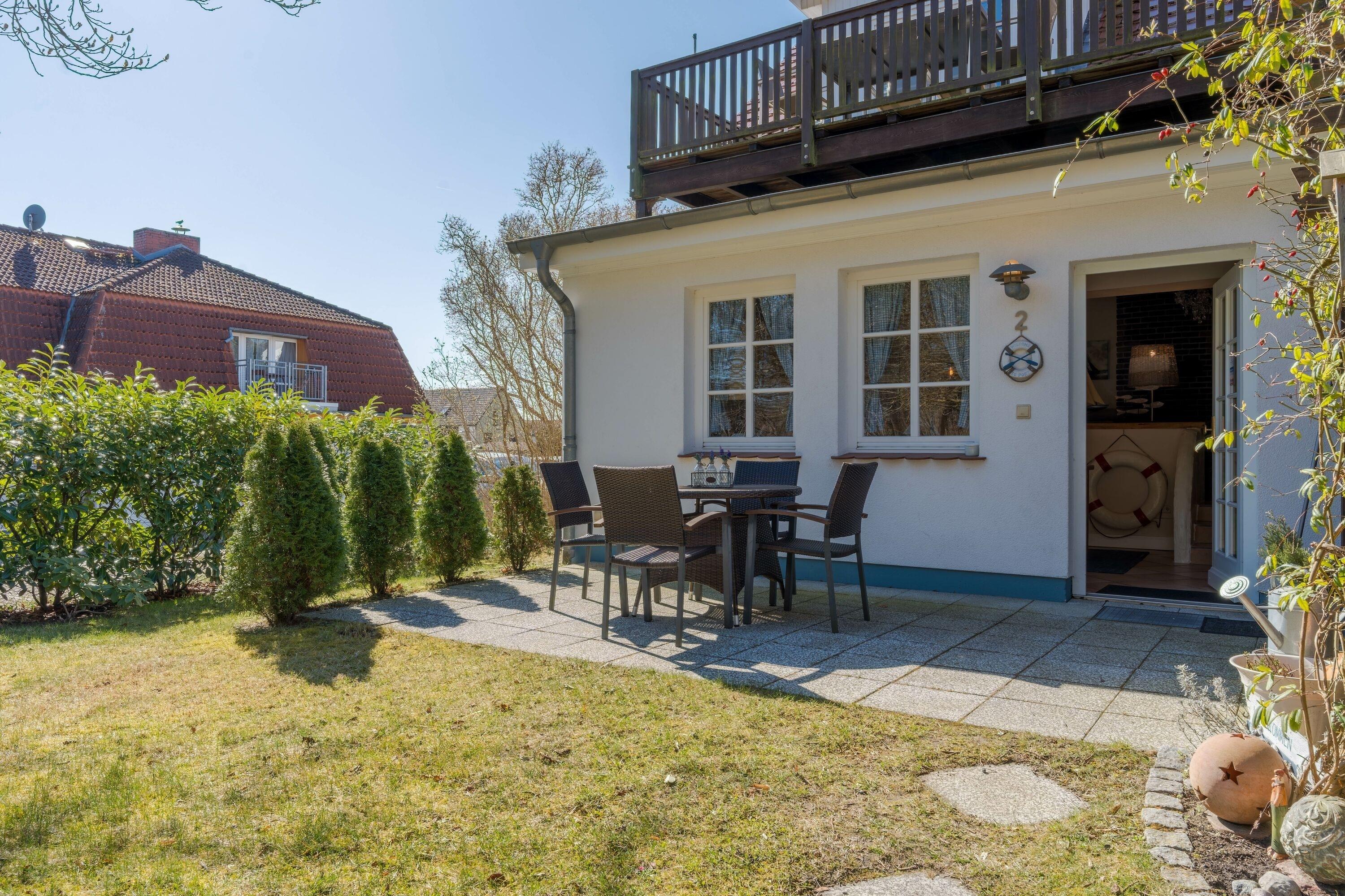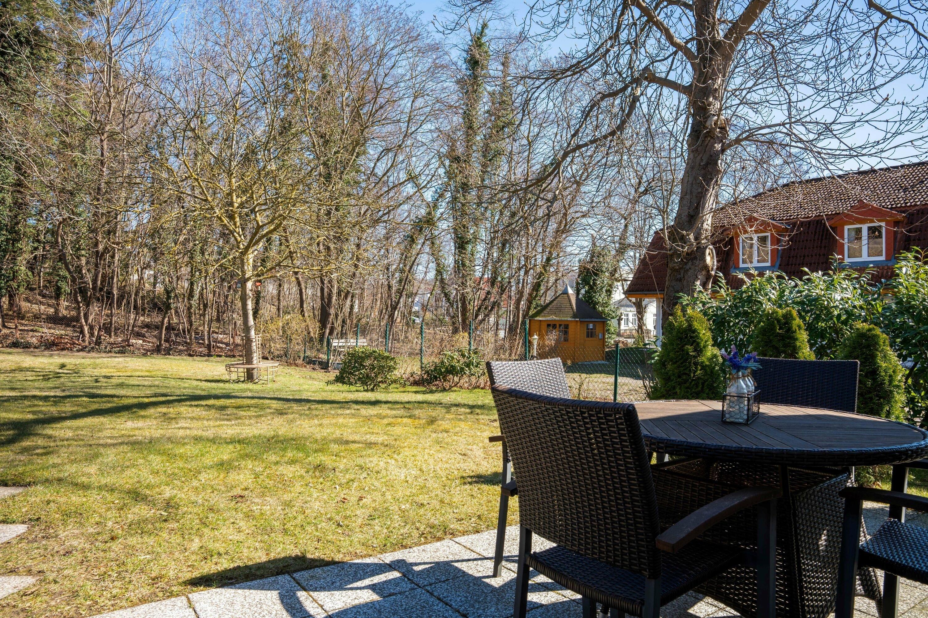 Die große Terrasse lädt zu entspannten Stunden im Freien ein – ob beim Frühstück in der Morgensonne oder beim Ausklang des Tages mit einem Glas Wein. Der gepflegte Garten mit Liegewiese und Gartenmöbeln bietet zusätzlichen Raum zum Relaxen.