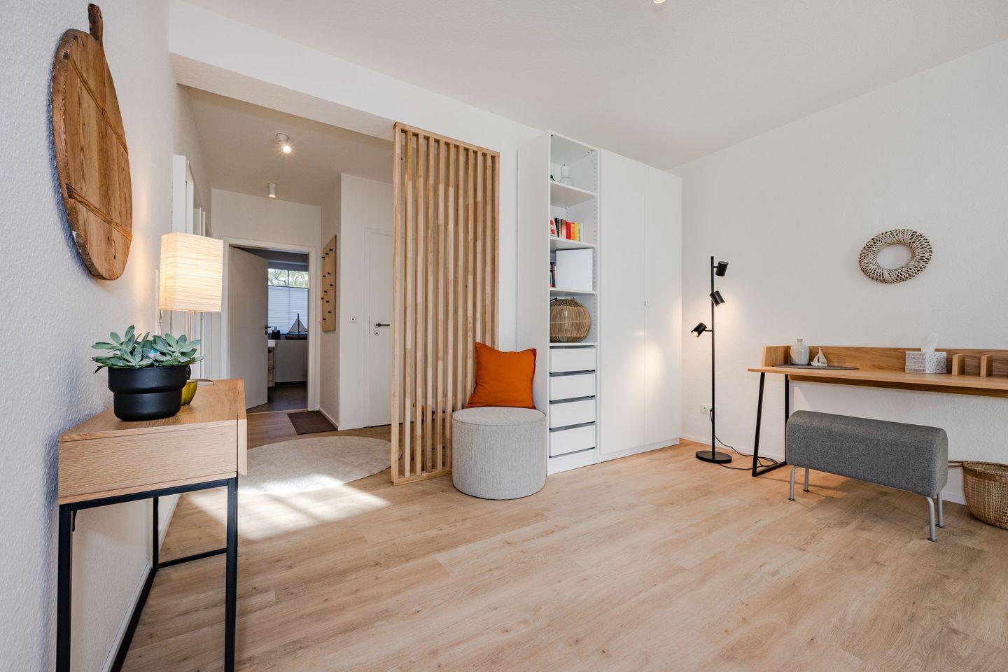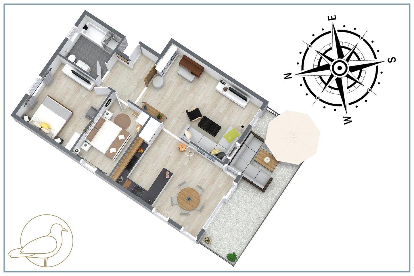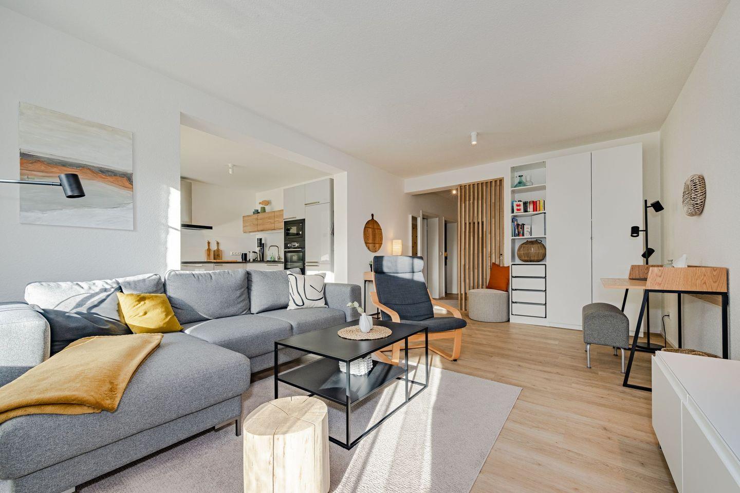 Das Appartement befindet sich im Erdgeschoss des Hauses, verfügt über 77 Quadratmeter Wohnfläche und bietet Platz für bis zu vier Personen. Der Wohnraum ist aufgrund der hohen Fensterfront offen und hell gestaltet und mit Couch, TV, Sessel und Schreibtisch eingerichtet. Dank vieler liebevoller Details wird dieser Raum zu Ihrem absoluten Wohlfühlort. Nutzen Sie eigene TV-Streamingdienste, lassen Sie das Internetradio mit Ihrer Wunschmusik laufen oder genießen Sie die Ruhe mit einem Buch in der Hand.
