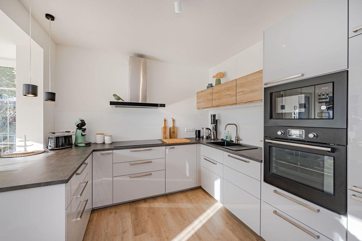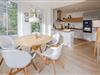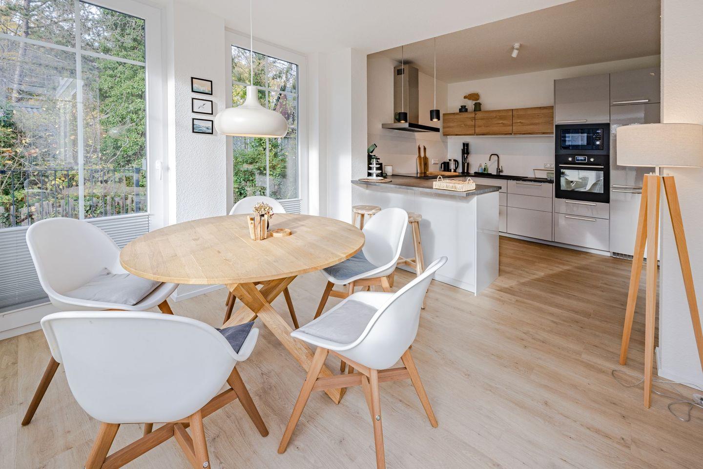 Unmittelbar an das Wohnzimmer anschließend befindet sich die Küche, welche jedoch durch die Architektur des Raumes klar abgegrenzt wird. Sie verschafft Ihnen dank hochwertiger Helfer wie dem 4-Platten-Herd, Backofen, Kühlschrank, Spülmaschine und vieler weiterer nützlicher Einrichtungsgegenstände ein hervorragendes Kocherlebnis - auch im Urlaub. Setzen Sie sich anschließend, zusammen mit der Familie, in den lichtdurchfluteten Erker an den großen Esstisch. Wollen Sie lieber das sonnige Wetter nutzen, so können Sie es sich auf der gepolsterten Möblierung der einladenden Terrasse bequem machen. Am Abend erzeugt die Außenbeleuchtung im Zusammenspiel mit der naturbelassenen Umgebung ein traumhaftes Ambiente.