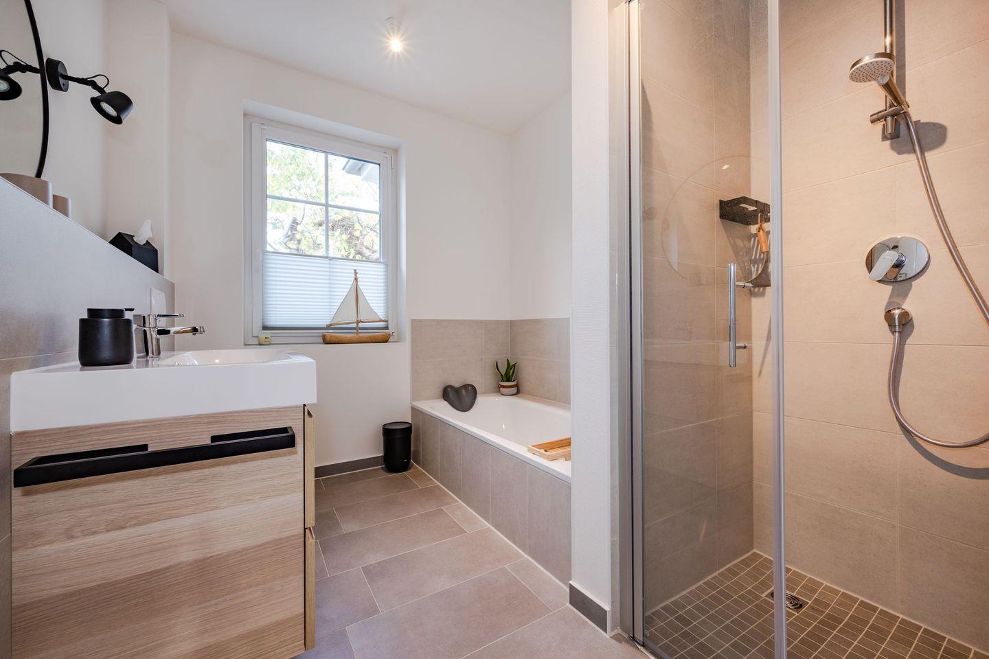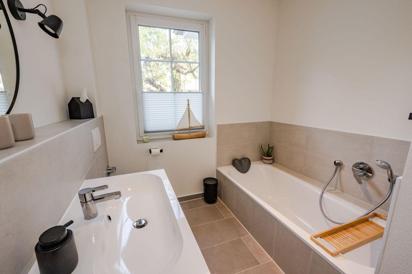 Beide Schlafzimmer versprechen erholsamen Schlaf und sind geschmackvoll hergerichtet. Sie bieten je ein Doppelbett und einen Kleiderschrank. Das erste Schlafzimmer verfügt zudem über eine Kommode und einen eigenen Fernseher. Das Badezimmer ist ausgestattet mit ebenerdiger Dusche, Badewanne, WC und Waschbecken und sorgt für einen rundum erholsamen Aufenthalt.