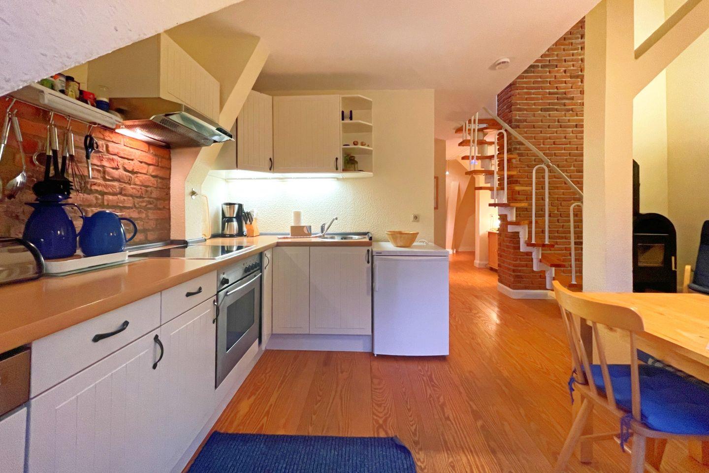 Schritt für Schritt gelangen Sie in die großzügige, offen gestaltete Wohnküche, die nicht nur mit modernen Küchenutensilien, wie Herd, Backofen, Spülmaschine und Kühlschrank ausgestattet ist, sondern auch über einen gemütlichen Essbereich verfügt. Verbringen Sie entspannte Abende auf der Couch im Wohnzimmer oder genießen Sie den knisternden Vorteil eines Kaminofens, der in den kühleren Monaten eine wohlige Wärme verbreitet. Die großen Fenster sorgen für helles Licht und schaffen eine freundliche Atmosphäre.