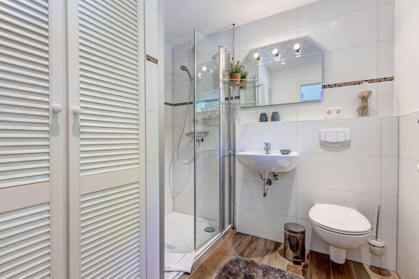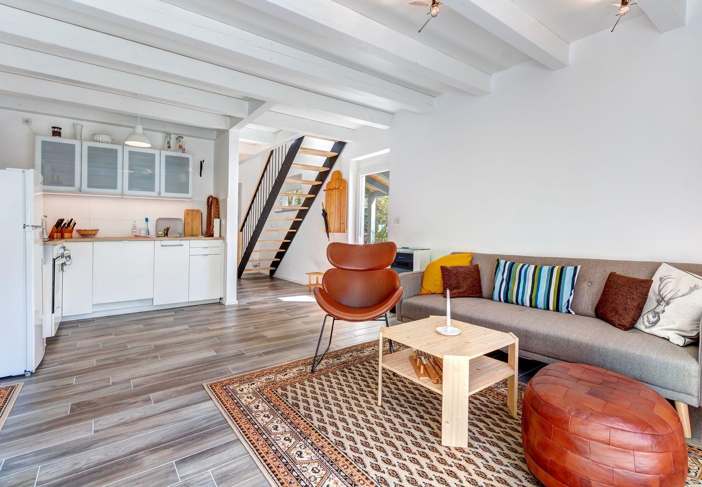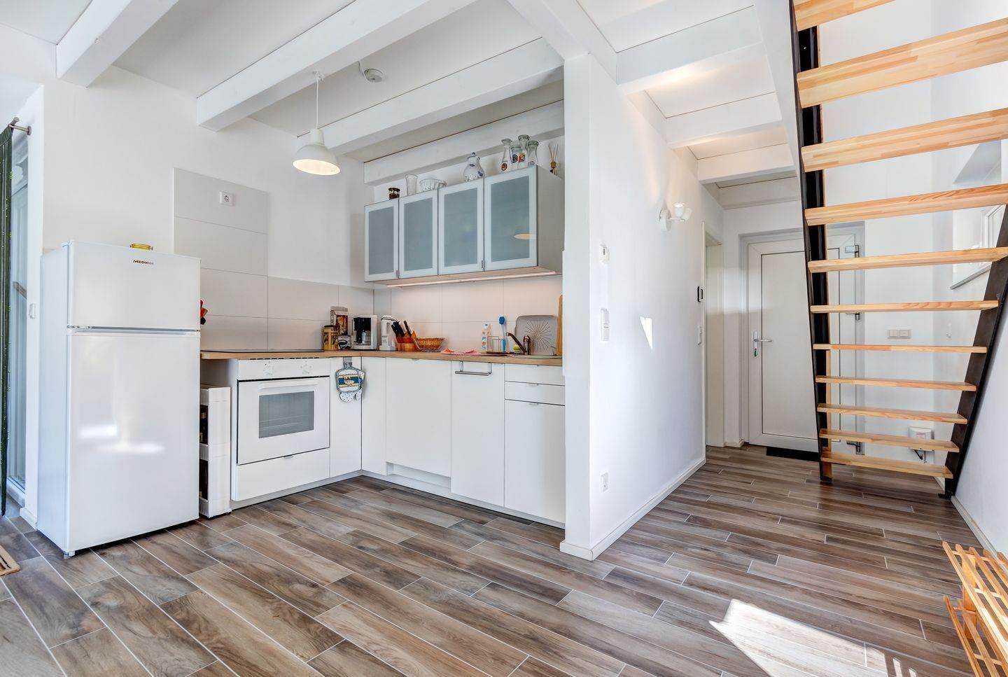 Im Erdgeschoss erwartet Sie ein heller, offener Wohn-Küchen-Bereich, der mit seiner modernen Vollausstattung zum Verweilen einlädt. Das Badezimmer verfügt über eine angenehm große Dusche sowie eine Waschmaschine – perfekt für einen komfortablen Aufenthalt.