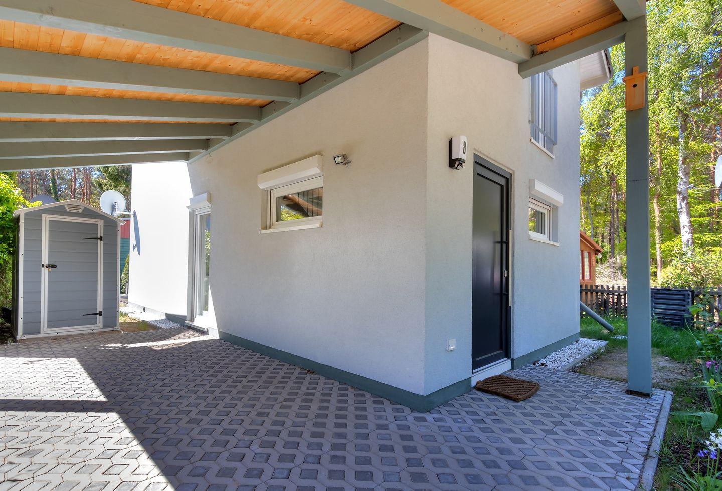 Das Obergeschoss bietet ein großzügiges Schlafzimmer mit einem gemütlichen Doppelbett sowie ein kleineres Zimmer mit einem praktischen Schlafsofa. Ihr Auto parken Sie bequem und sicher unter dem Carport direkt auf dem Grundstück.