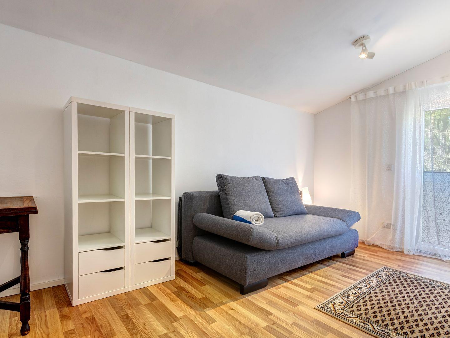 Das Obergeschoss bietet ein großzügiges Schlafzimmer mit einem gemütlichen Doppelbett sowie ein kleineres Zimmer mit einem praktischen Schlafsofa. Parkplatz befindet sich am Haus.