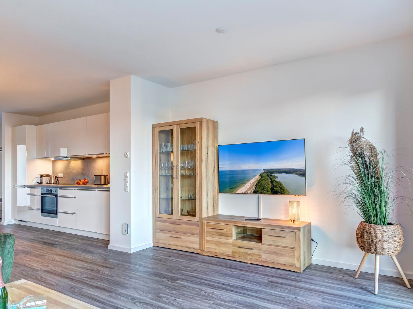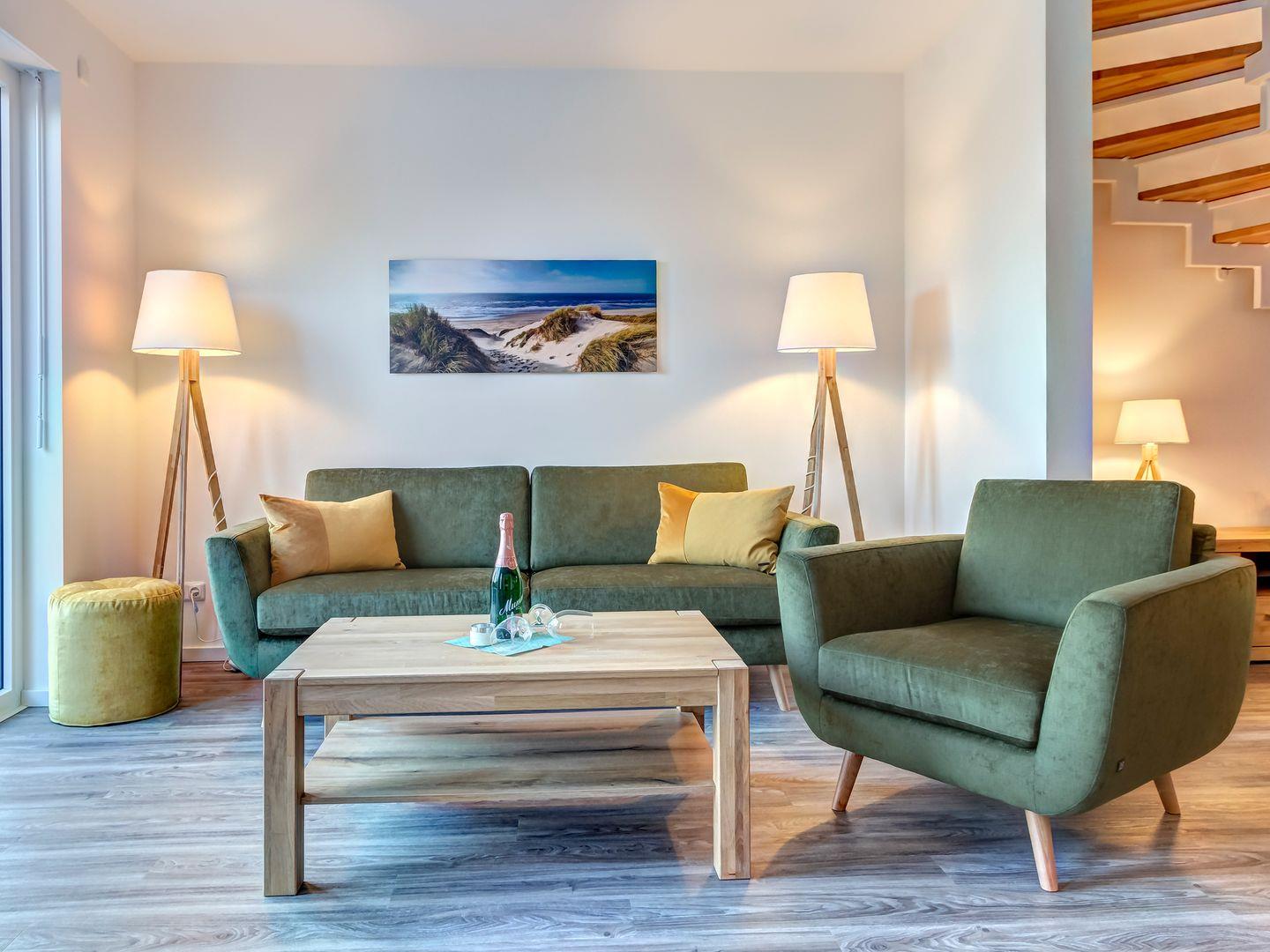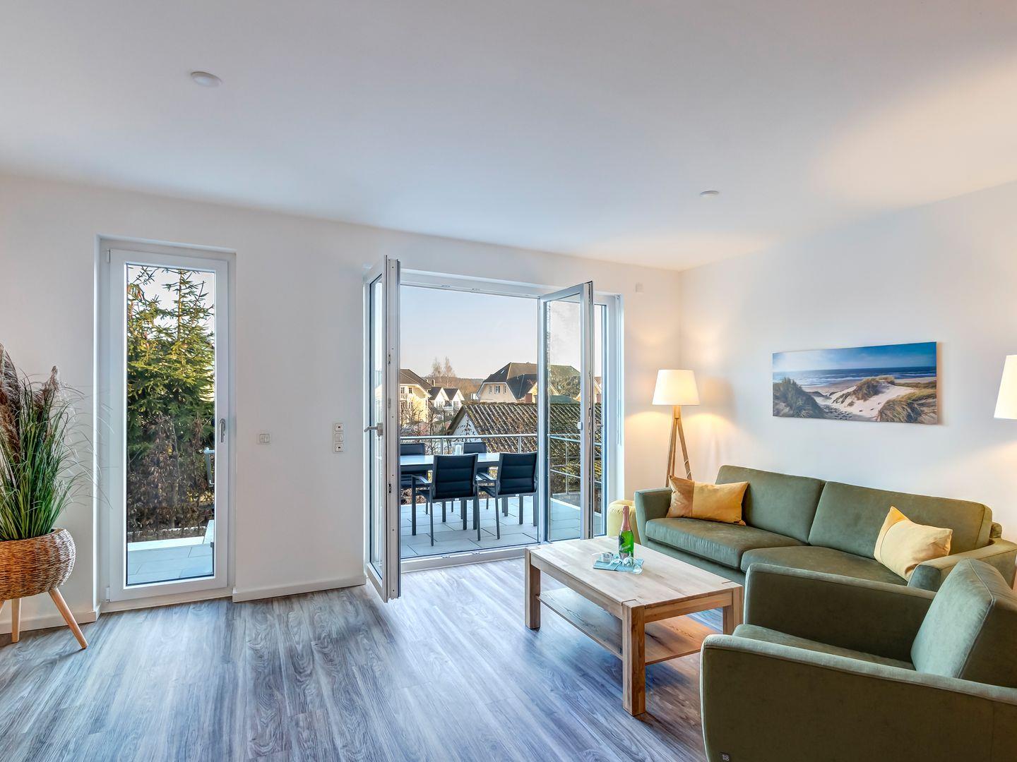 Der großzügige Wohnbereich ist der ideale Ort, um gemeinsam zu entspannen und lädt zum Verweilen ein. Hier öffnet sich der Raum zu einem sonnigen Balkon, auf dem Sie Ihre Urlaubszeit an der frischen Luft genießen können.
