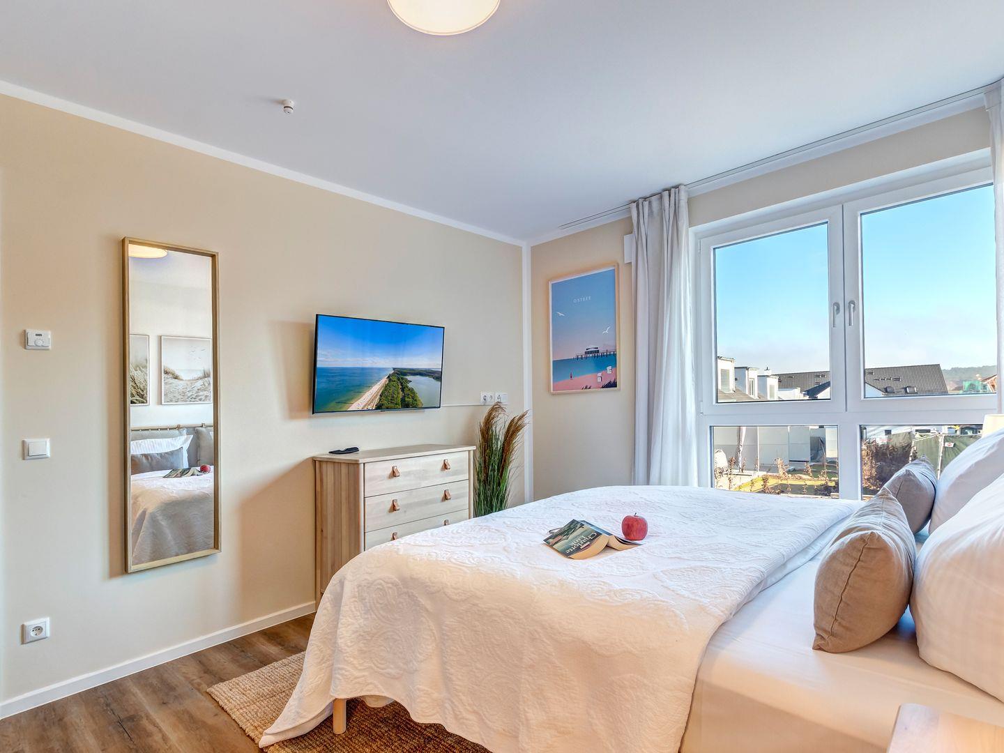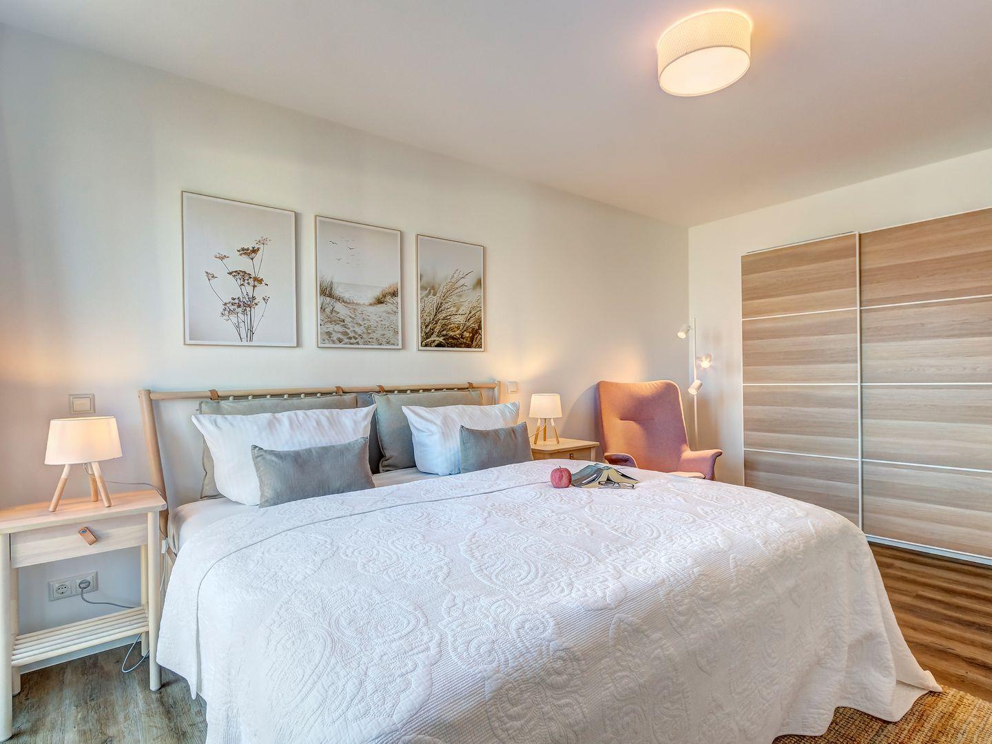 Das Schlafzimmer bietet ein bequemes 180x200 cm Doppelbett, Nachtschränkchen, Leselampen, einen geräumigen Kleiderschrank, Lesesessel und einen Flachbild-TV.