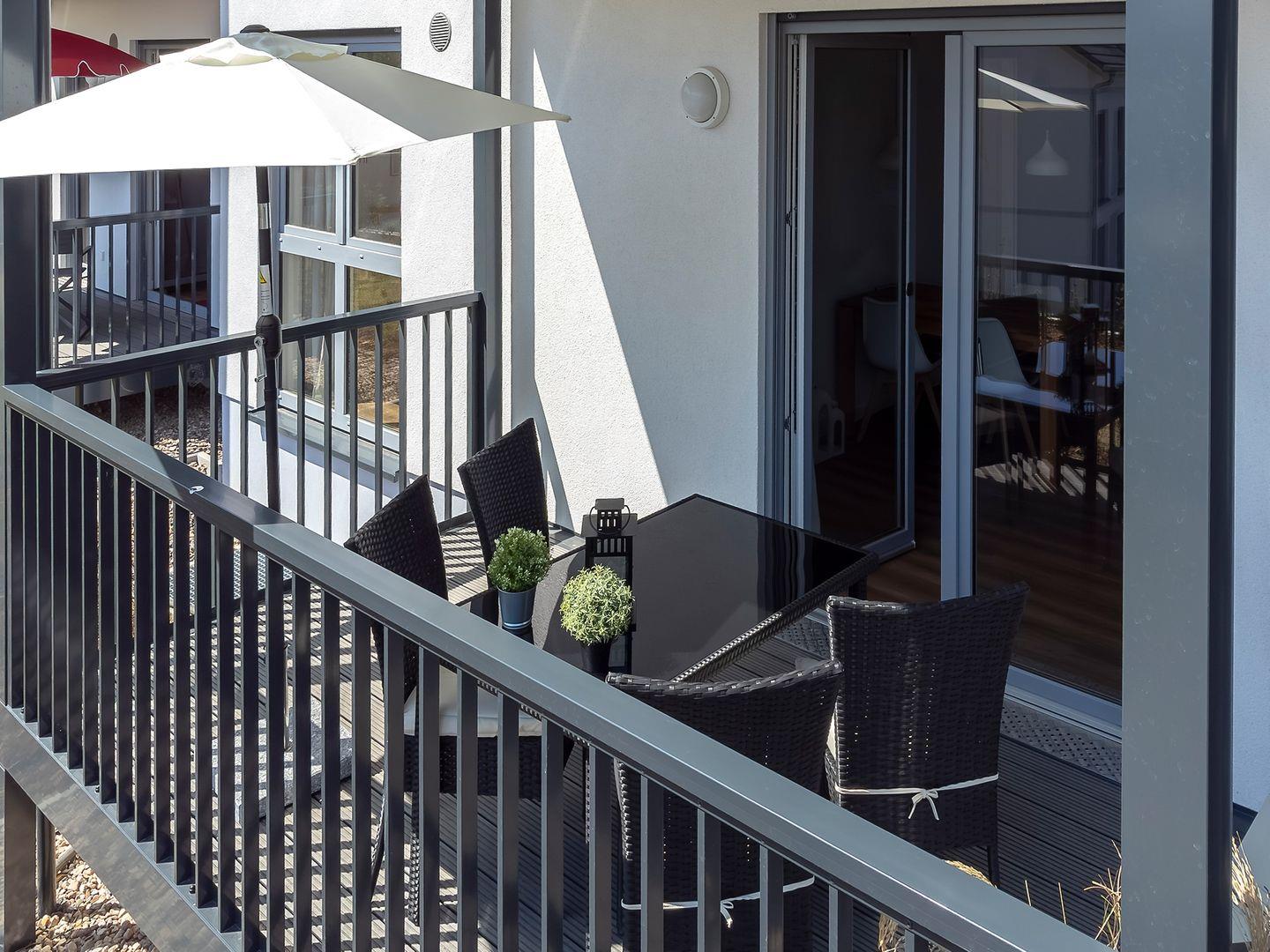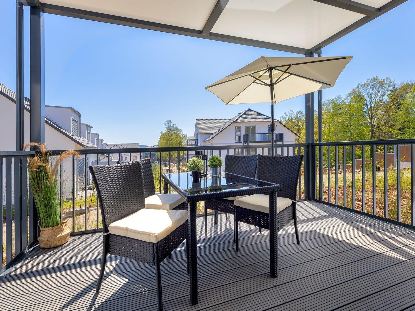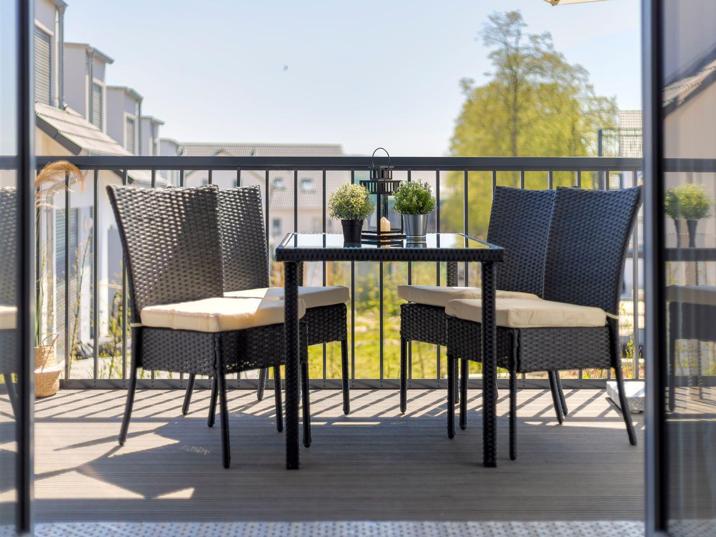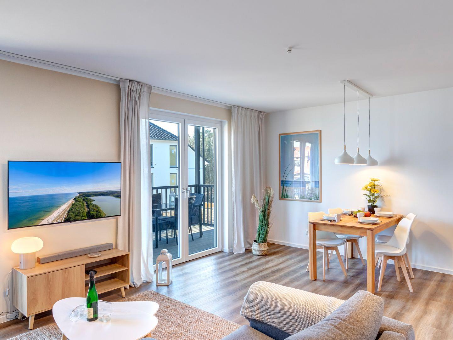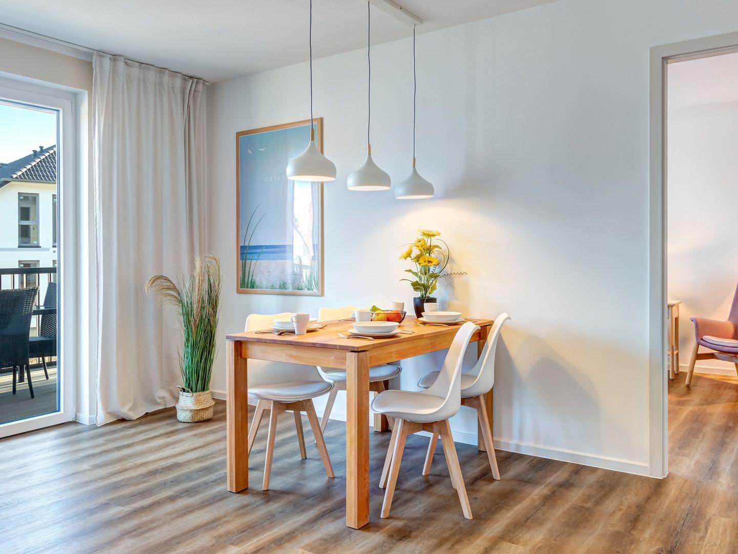 Der lichtdurchflutete Wohn- und Essbereich öffnet sich zum Balkon mit Südost-Ausrichtung, Esstisch für vier Personen und gemütlichen Sitzgelegenheiten. Genießen Sie Ihr Frühstück oder entspannen Sie mit einem Glas Wein am Abend.