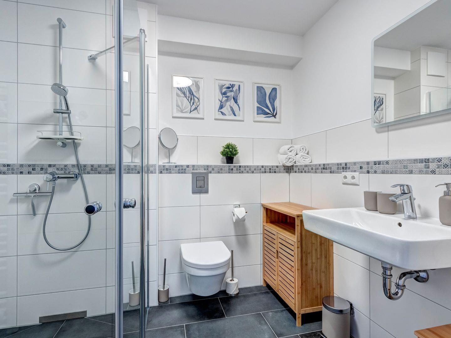 Das moderne Bad verfügt über eine große bodenebene Dusche, Handtuch-Heizkörper, Föhn und einen beleuchteten Spiegel.
