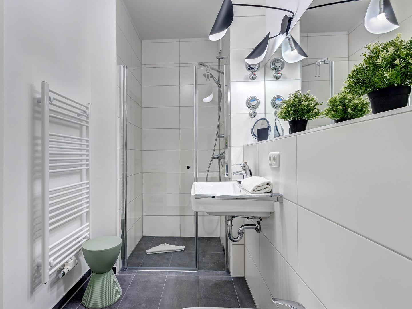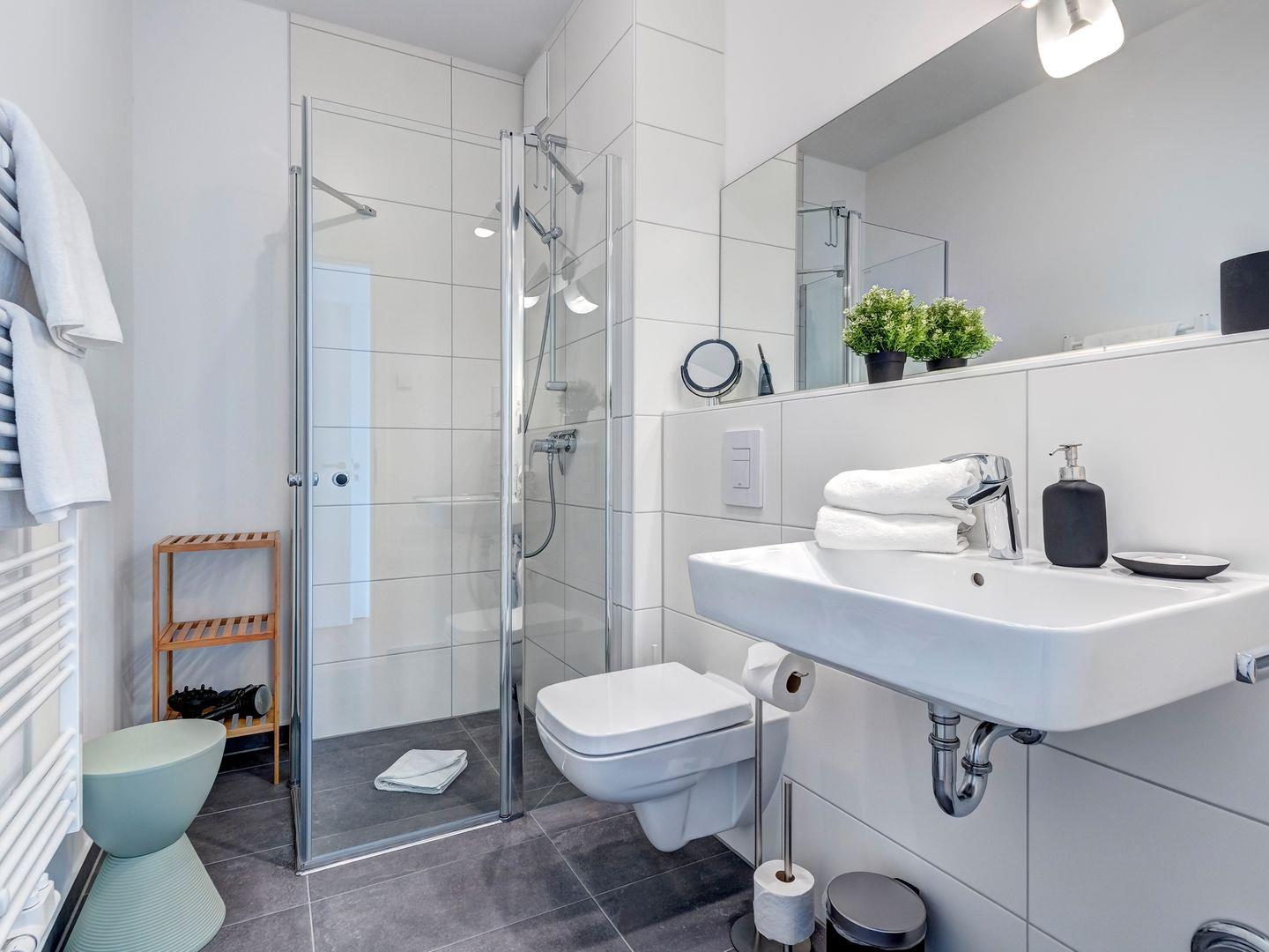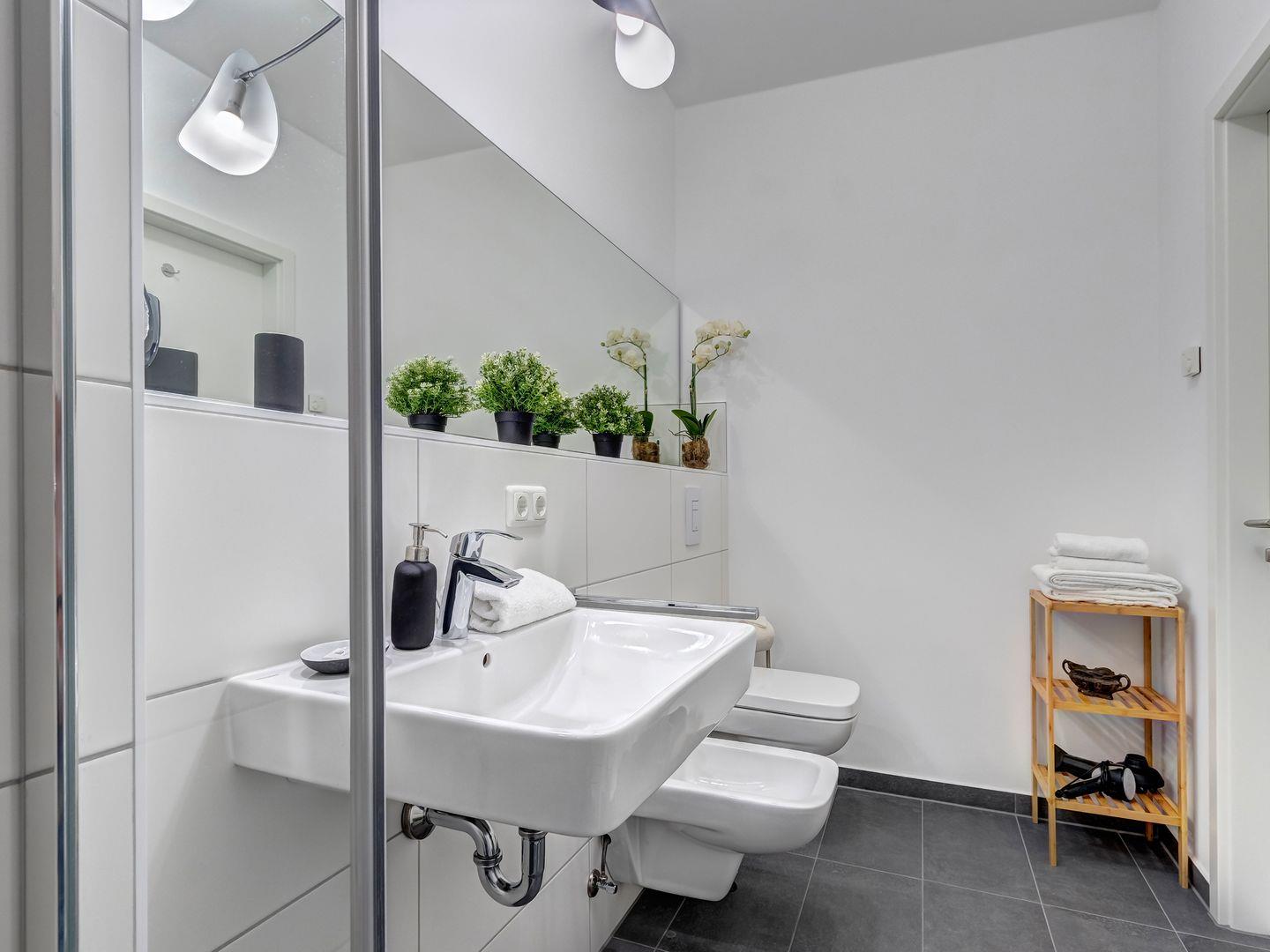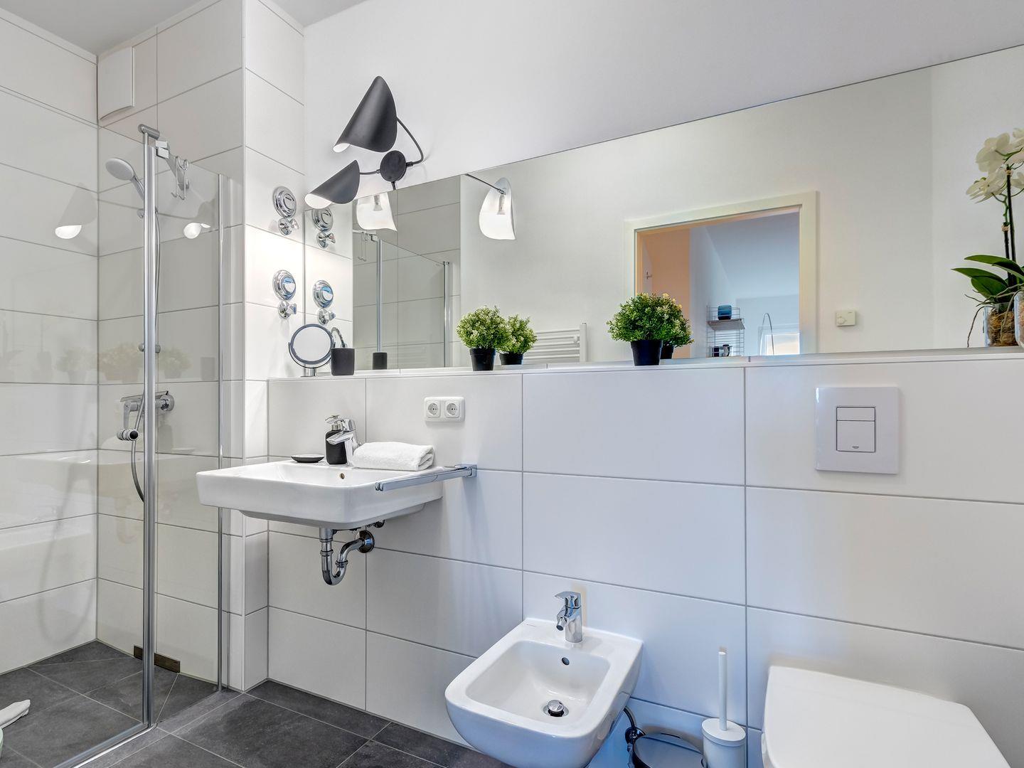 Die beiden Badezimmer sind jeweils mit einer Gansglas-Walk-In-Dusche, Waschbecken und Handwaschbecken ausgestattet. In dem größeren Badezimmer kann zudem noch ein Bidet genutzt werden.