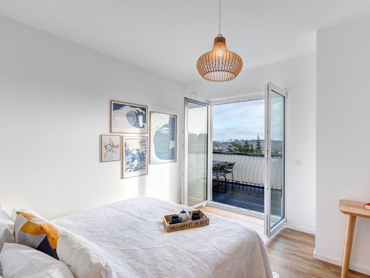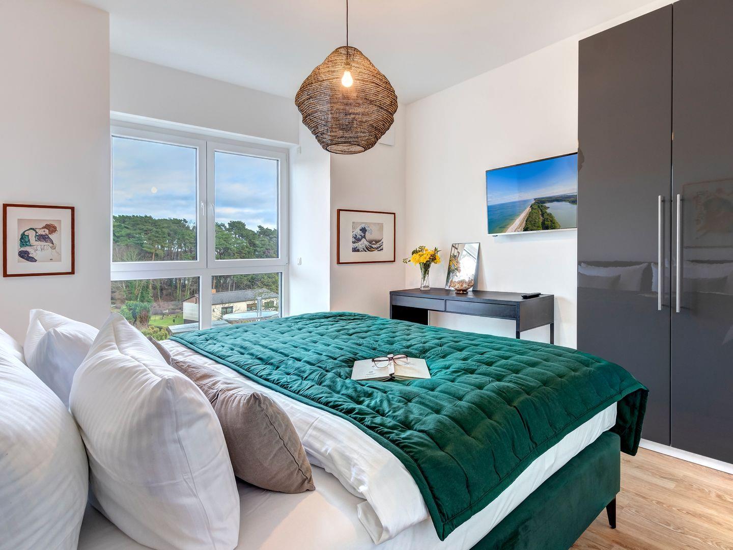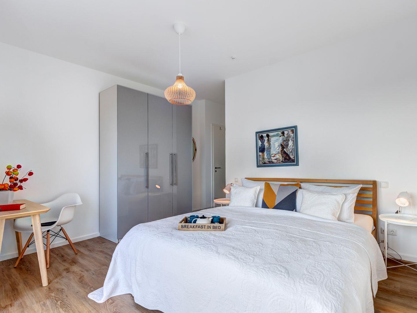 Die beiden Schlafräume sind jeweils mit einem behaglichen Doppelbett ausgestattet. In den vorhandenen Kleiderschränken findet ihre Urlaubsgarderobe Platz und die kleinen Tische mit den gemütlichen Sitzmöglichkeiten dienen als Workation Stationen, Schminktisch oder als Schreibtisch für die Urlaubspost.