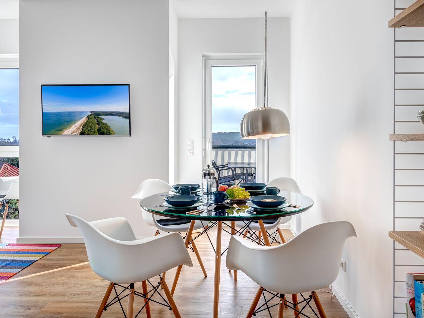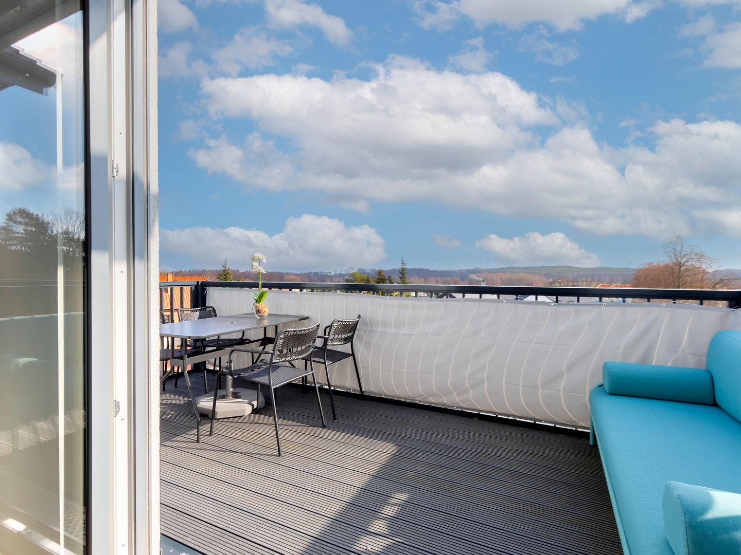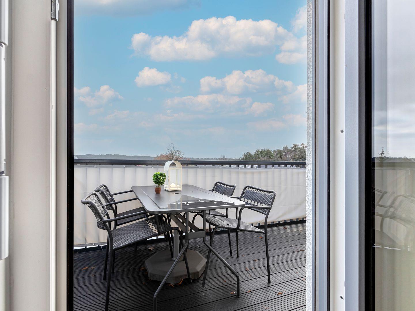 Der großzügige Balkon bietet neben einem Tisch mit 4 Stühlen noch zusätzlich Platz für ein Outdoor Sofa. Vom Balkon haben Sie eine wunderbare Aussicht auf den Kölpinsee. Ein Appartement zum Wohlfühlen – wir freuen uns auf Sie.