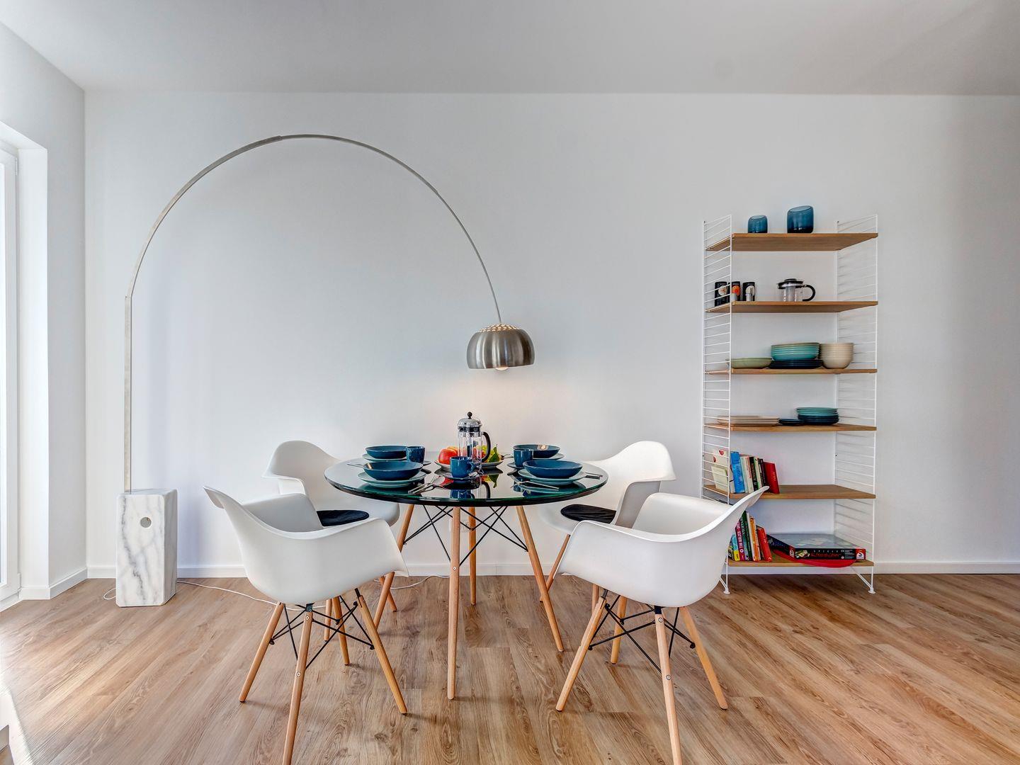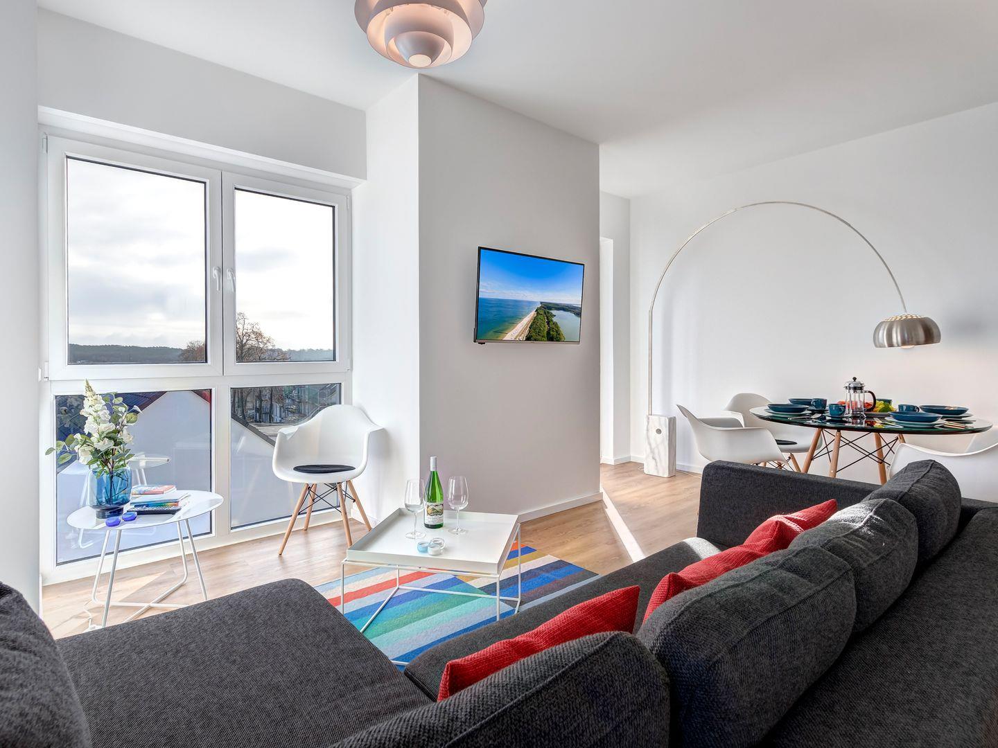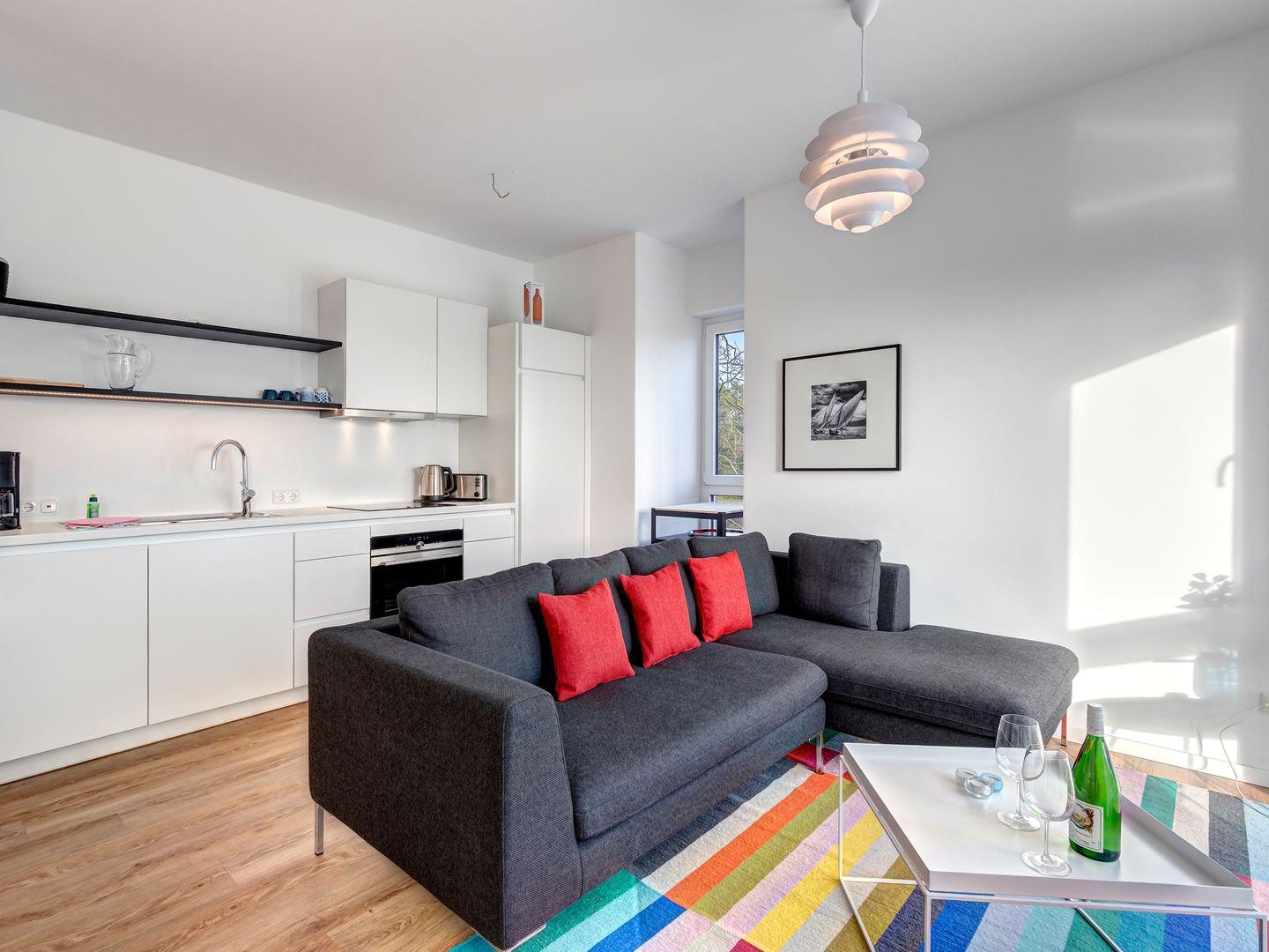 Modern, hochwertig und ein Hauch Minimalismus über den Dächern von Kölpinsee - dieses traumhafte Appartement im Dachgeschoss begrüßt maximal 4 Personen aufs herzlichste. Auf 80 Quadratmeter Wohnfläche erwarten Sie ein großzügiger Wohn-/Essbereich. Die große Sofalandschaft besticht durch den herrlichen Blick in den Ort. Der runde Esstisch mit den bequemen Schalensesseln empfängt Sie zum gemeinsamen Frühstück.