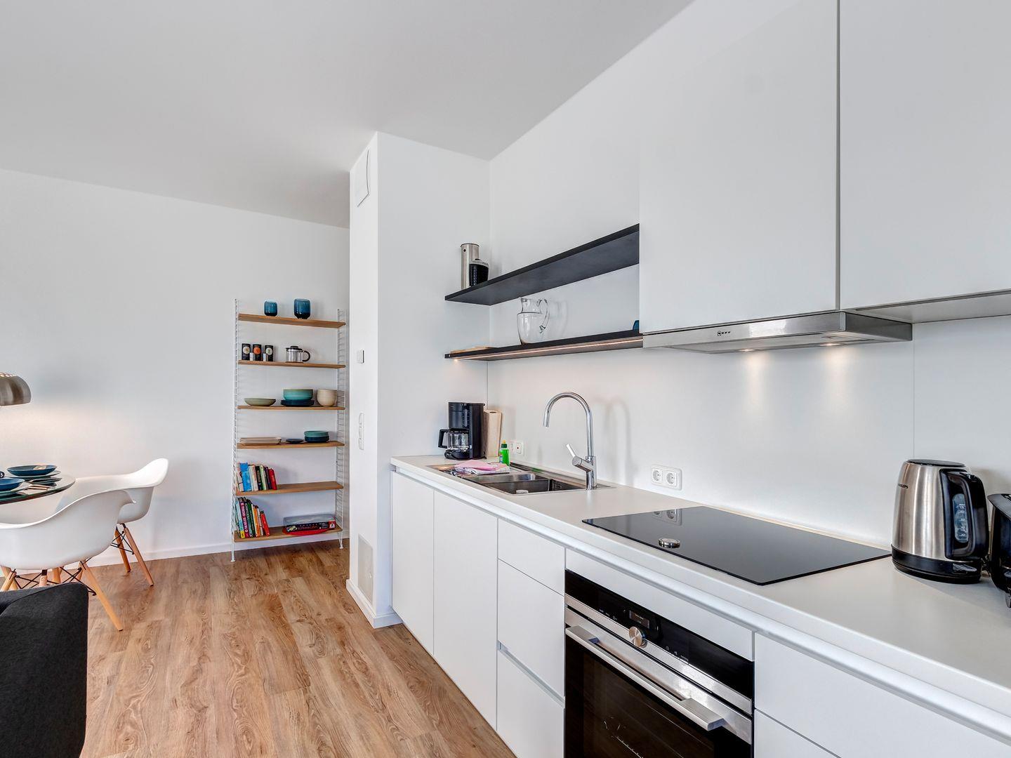 Die im Wohnraum integrierte Küchenzeile lädt zum gemeinsamen Kochen ein. Egal ob Induktionskochfeld, Handmixer, Pürierstab, Kühlschrank mit Gefrierfach, Backofen und Mikrowelle – hier können sich Hobbyköche so richtig austoben. Das farbenfrohe Geschirr rundet das Kochvergnügen ab.