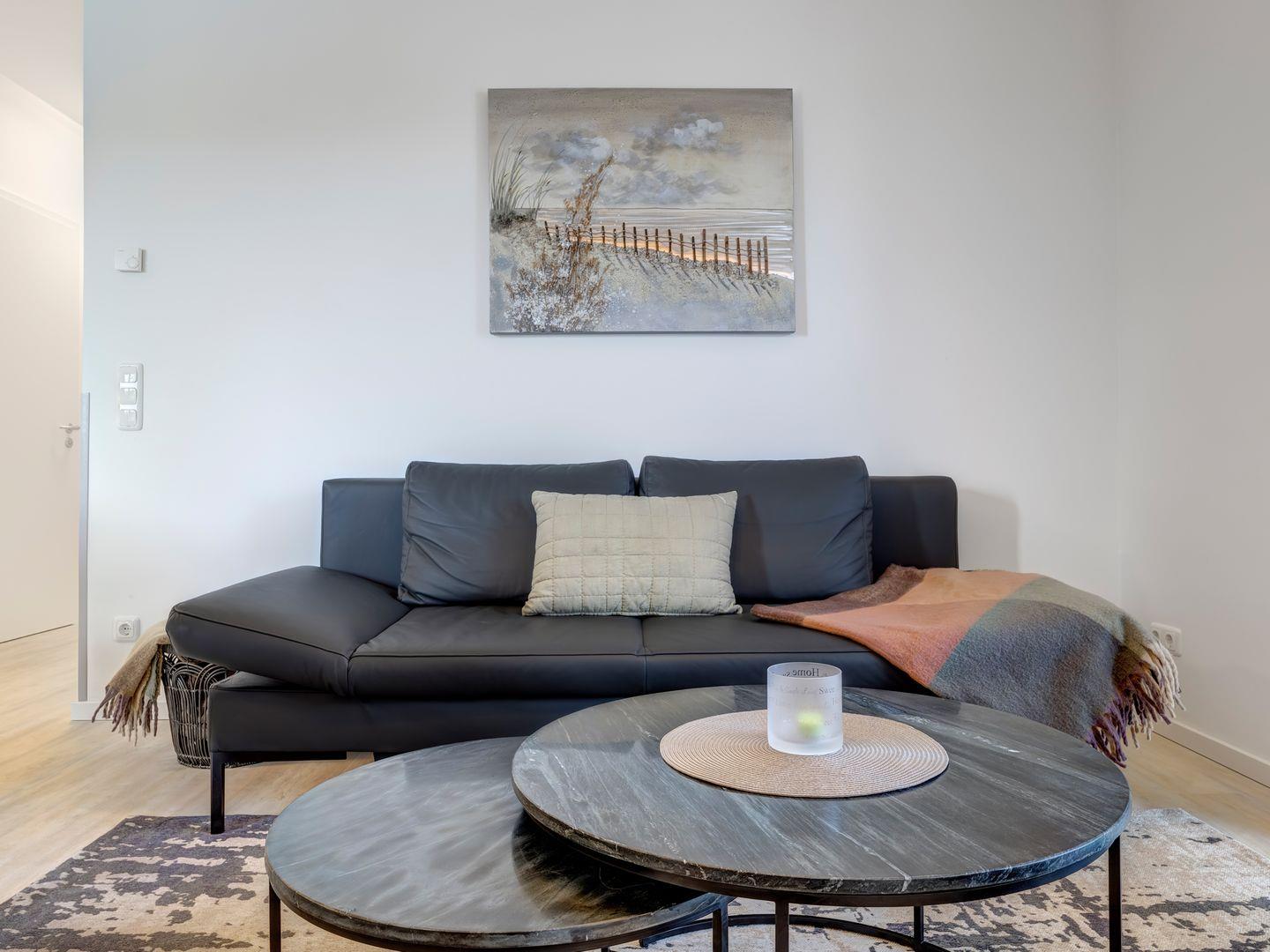 Der offene Wohnbereich bietet Ihnen im Küchenbereich sämtlichen Freiraum für Ihre Bedürfnisse und stellt Ihnen eine Vollausstattung zur Verfügung. Im Wohnbereich finden Sie nach einem ausgefüllten Urlaubstag Entspannung auf dem Ledersofa, dem Hochlehnsessel oder vor dem Smart- TV entsprechende Entspannung.