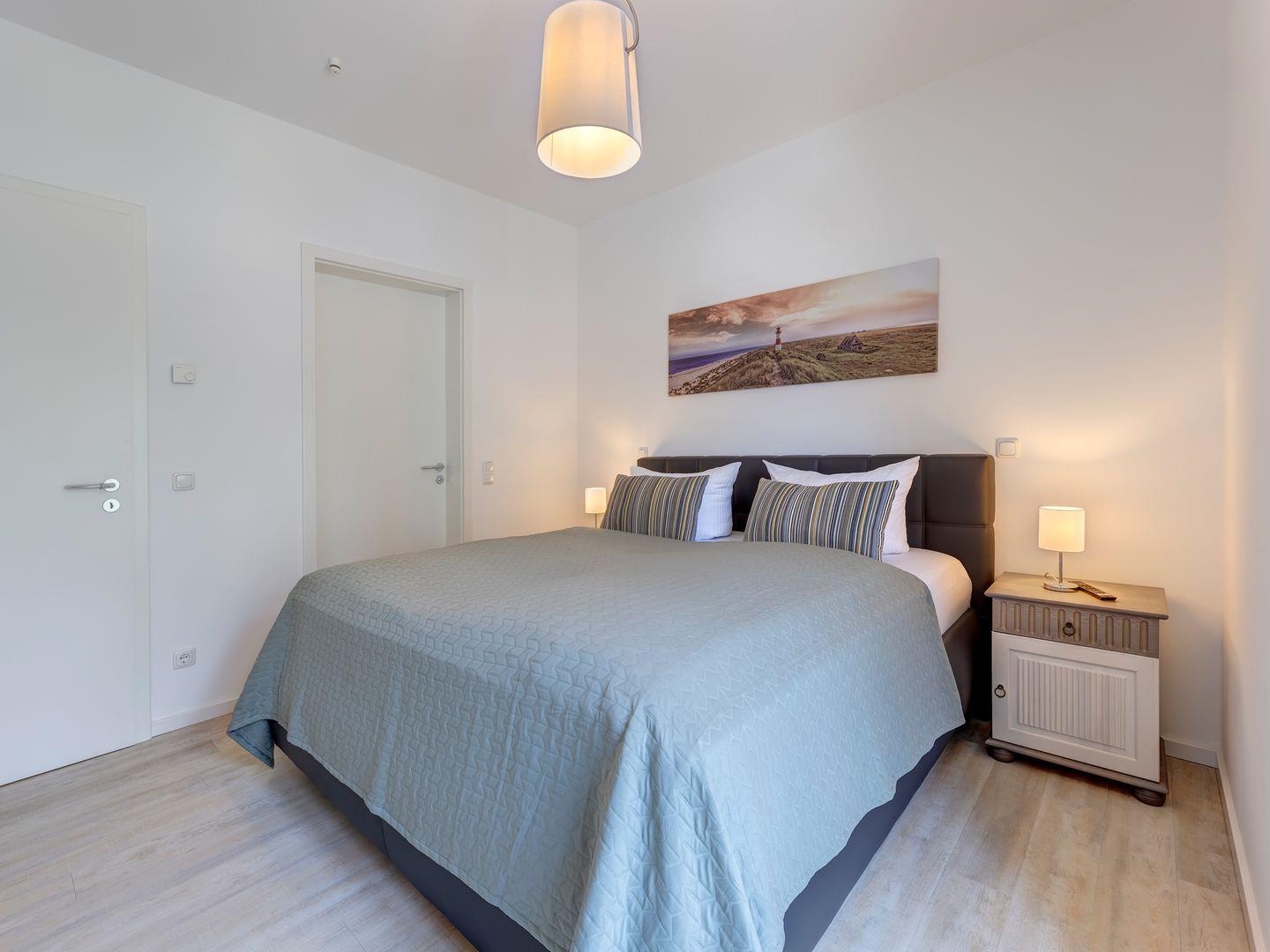 Auf Ihren erholsamen Schlaf müssen Sie auch im Urlaub nicht verzichten. Die Schlafzimmer sind jeweils mit einem Boxspringbett einem 43 Zoll Smart- TV und geräumigen Kleiderschrank und Kommoden ausgestattet. Einen direkten Zugang zum Duschbad haben Sie von einem der Schlafzimmer.