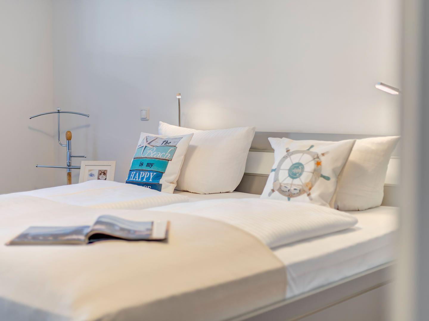 Im geräumigen Wohnzimmer erwarten Sie eine komfortable Ledercouch und ein Sessel, ideal zum Entspannen nach einem Tag am Strand. Das Schlafzimmer verfügt über ein Doppelbett sowie ein Schrankbett, sodass bis zu drei Personen bequem unterkommen können.