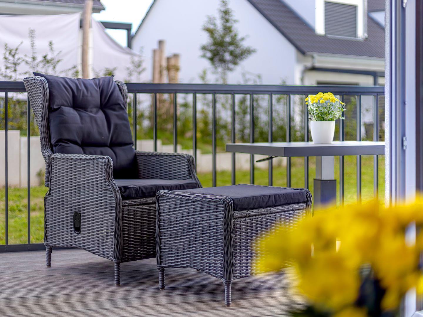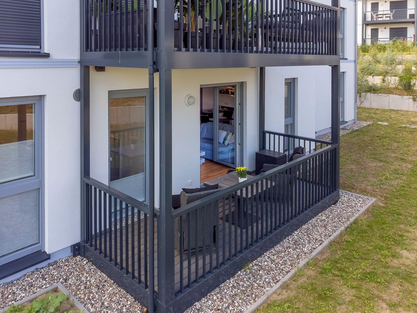 Die Wohnung befindet sich im Erdgeschoss und bietet einen überdachten Balkon mit einem höhenverstellbaren Tisch und bequemen Sesseln. Dieser Balkon ist sowohl vom Schlafzimmer als auch vom Wohnzimmer aus begehbar und bietet einen erholsamen Blick auf die Umgebung.