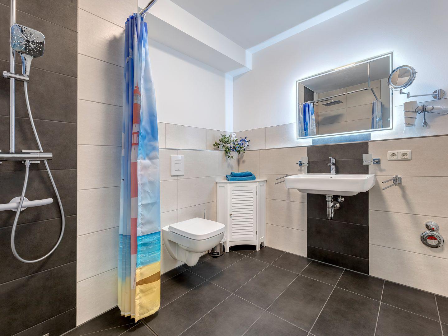 Das barrierefreie Badezimmer ist mit einer rollstuhlgerechten Dusche ausgestattet, die über einen integrierten Sitz, Griffe und einen drehbaren Duschkopf verfügt. Es gibt keine festen Duschwände, was die Nutzung besonders komfortabel macht.