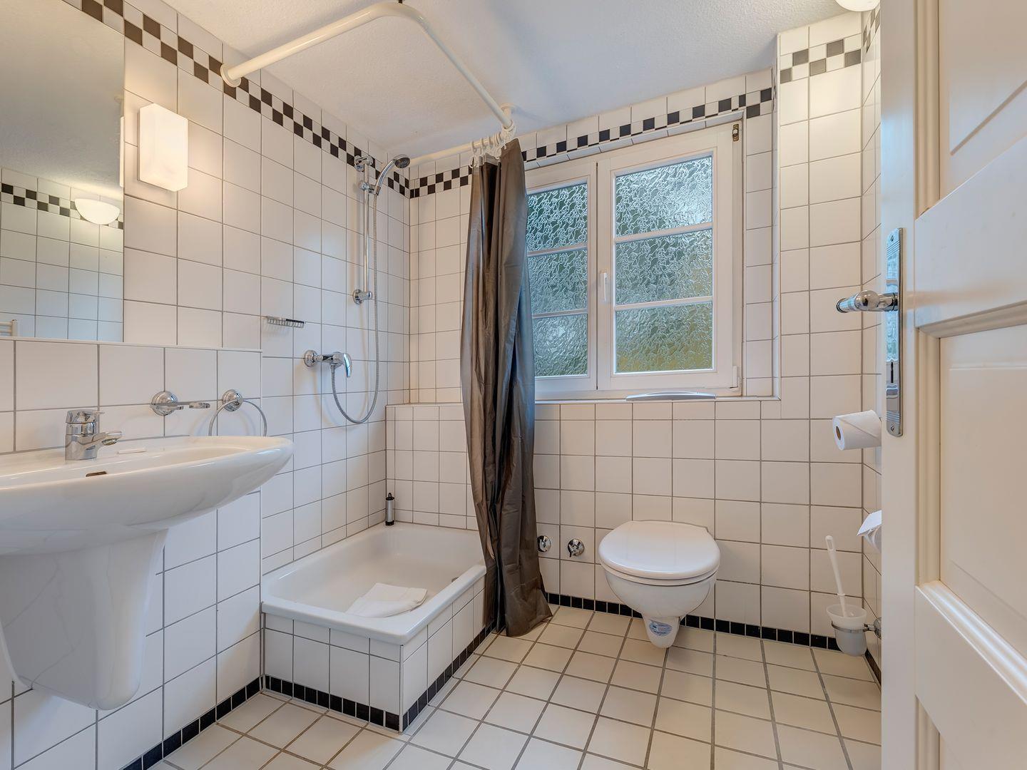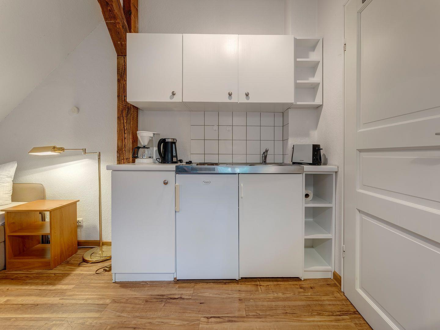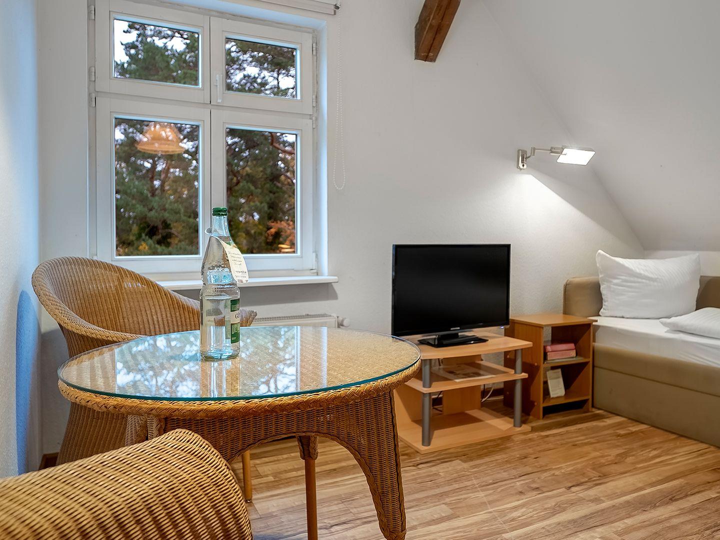 Die gemütliche Wohnung 6 ist besonders beliebt bei jungen Leuten, Ehepartnern, die Angehörige in der Klinik besuchen, und Großeltern, deren Familie die angrenzende Wohnung 7 gemietet haben. Bei stärkerem Meereswellengang kann man bei geöffnetem Fenster die Ostsee hören. Die Wohnung 6, etwa 22 qm groß, befindet sich im zweiten Obergeschoß. Sie besteht aus einem Wohnzimmer und einem separaten Badezimmer welches zugänglich über den Flur ist. Wohnzimmer und Badezimmer sind durch einen kleinen Flur verbunden, der auch von den Gästen der Wohnung 7 beim Betreten und verlassen der Wohnung genutzt wird. Der Kleiderschrank mit Ablagemöglichkeiten befindet sich im Bad. Im Wohnraum befinden sich zwei Einzelbetten, die hintereinander angeordnet sind, ein Fernseher, sowie eine Pantry-Küche mit zwei Herdplatten, Kühlschrank, Kaffeemaschine und Toaster.