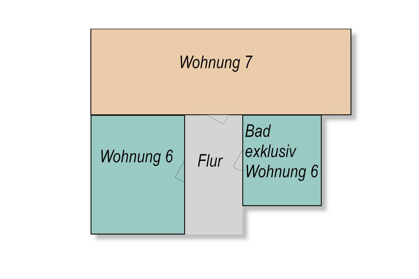 Die Wohnung 6 befindet sich im zweiten Obergeschoß. Sie besteht aus einem Wohnzimmer und einem separaten Badezimmer welches zugänglich über den Flur ist. Wohnzimmer und Badezimmer sind durch einen kleinen Flur verbunden, der auch von den Gästen der Wohnung 7 beim Betreten der Wohnung genutzt wird.