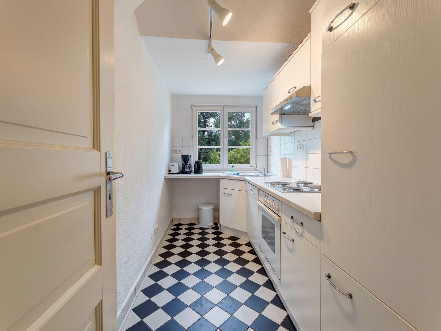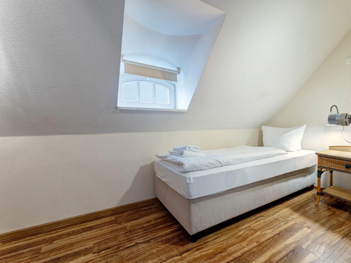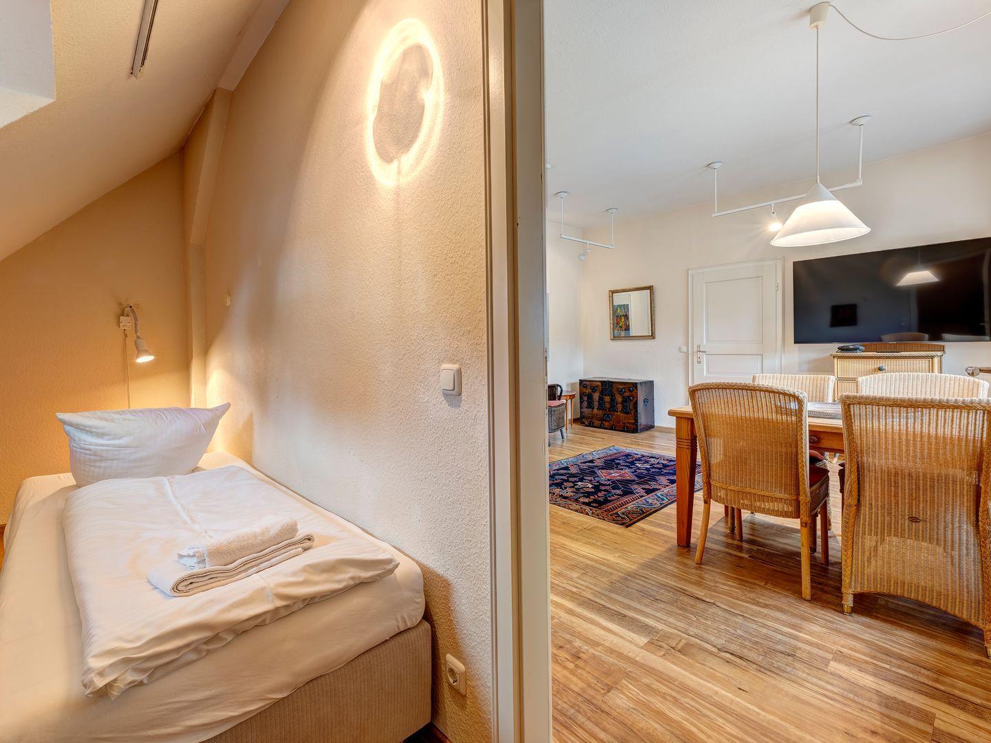 Sie bietet Platz für bis zu fünf Gäste und ein Kleinkind. Die Wohnung umfasst ein Wohnzimmer mit einer Schlafcouch für eine Person, ein Schlafzimmer mit zwei Einzelbetten, die durch ein gemeinsames Kopfteil verbunden sind, sowie zwei kleinere Schlafzimmer mit jeweils einem Einzelbett.