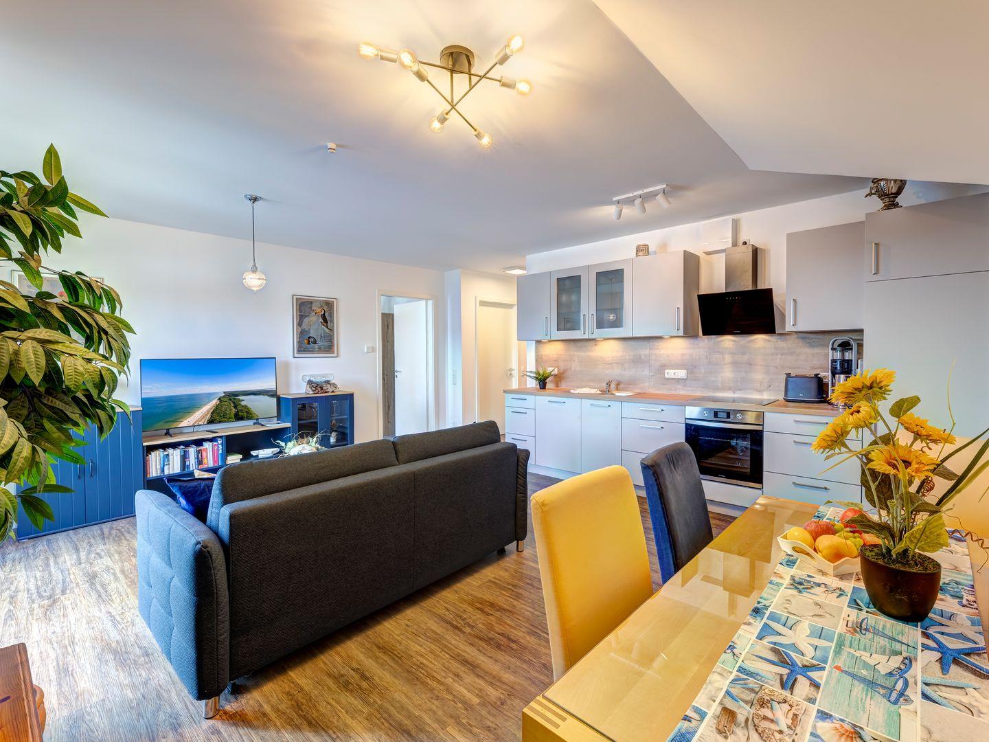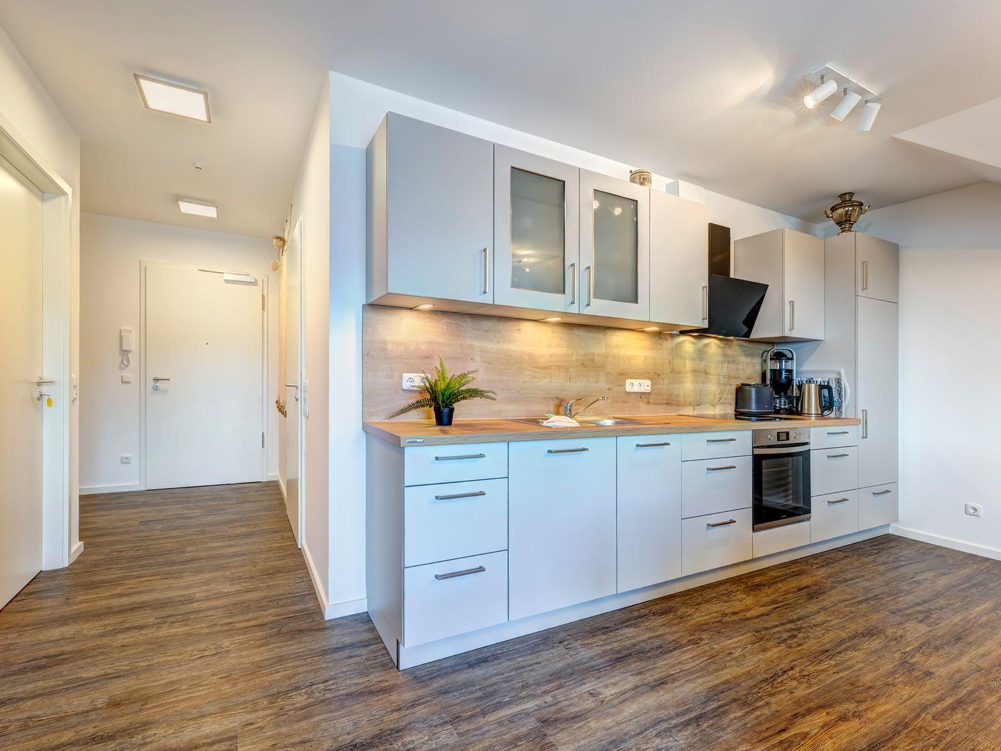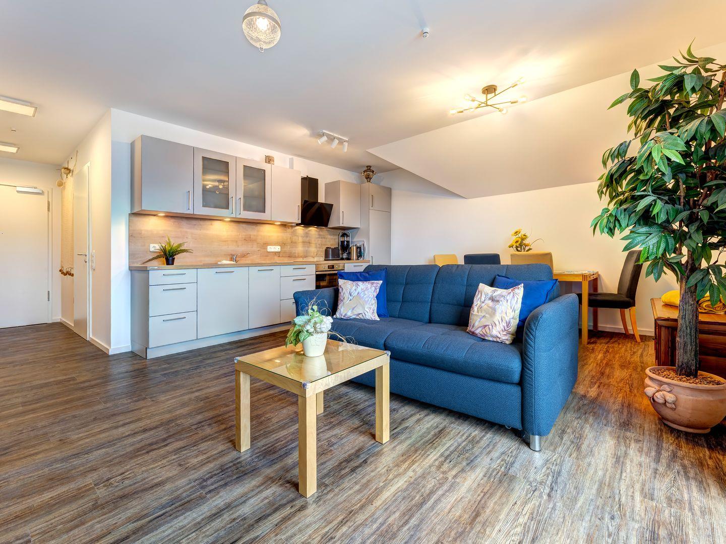 Die Dachgeschosswohnung ist barrierefrei über einen Fahrstuhl zu erreichen. Sie verfügt über ein separates Schlafzimmer mit Doppelbett, eine moderne und bequeme Ausziehcouch im Wohnzimmer mit Flat-Screen-TV, sowie ein barrierefreies Duschbad und eine offene gut ausgestattete Nolte-Küche.