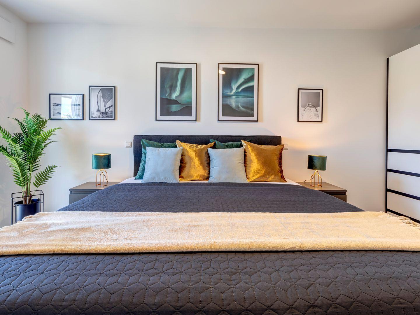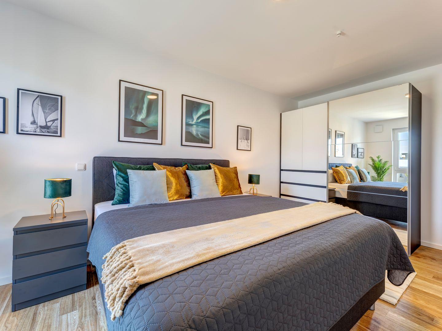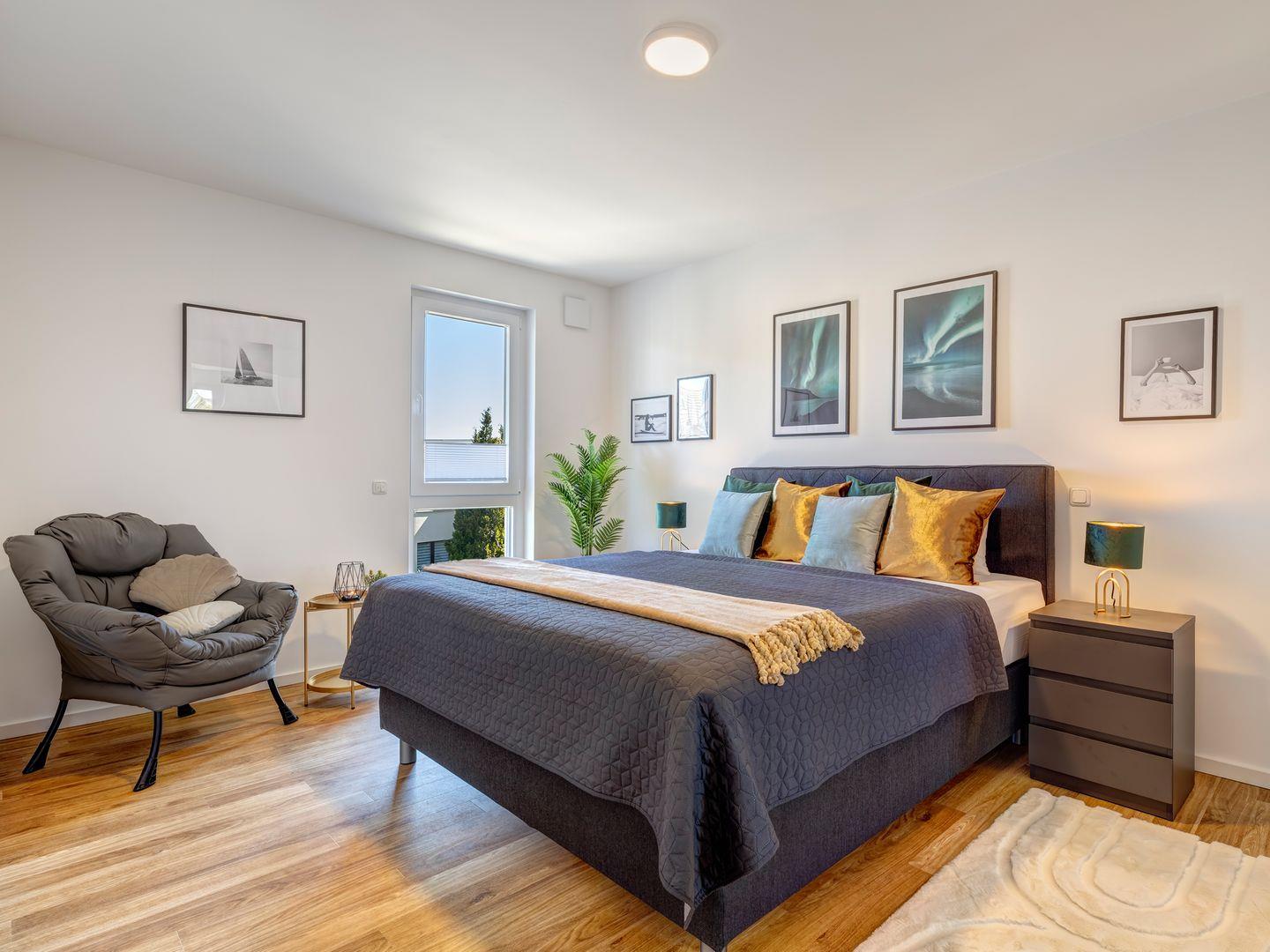 · Platz für maximal 4 Personen: Gemütliches Schlafzimmer mit Boxspringbett (180 x 200 cm)