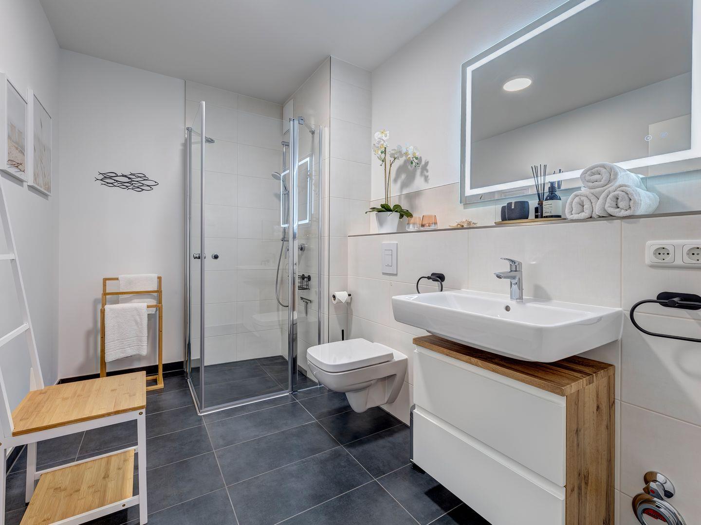· bequemes Badezimmer mit Dusche, Waschtisch und WC