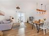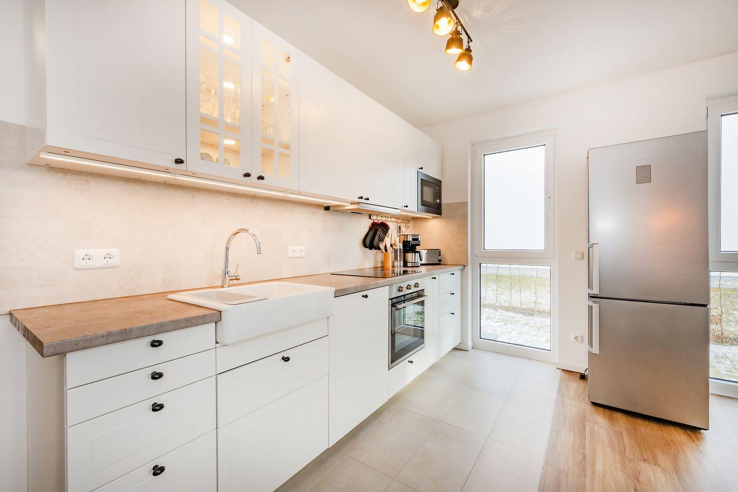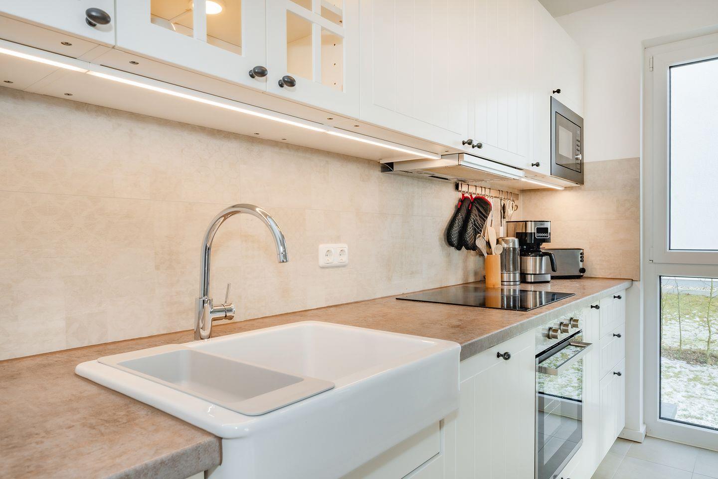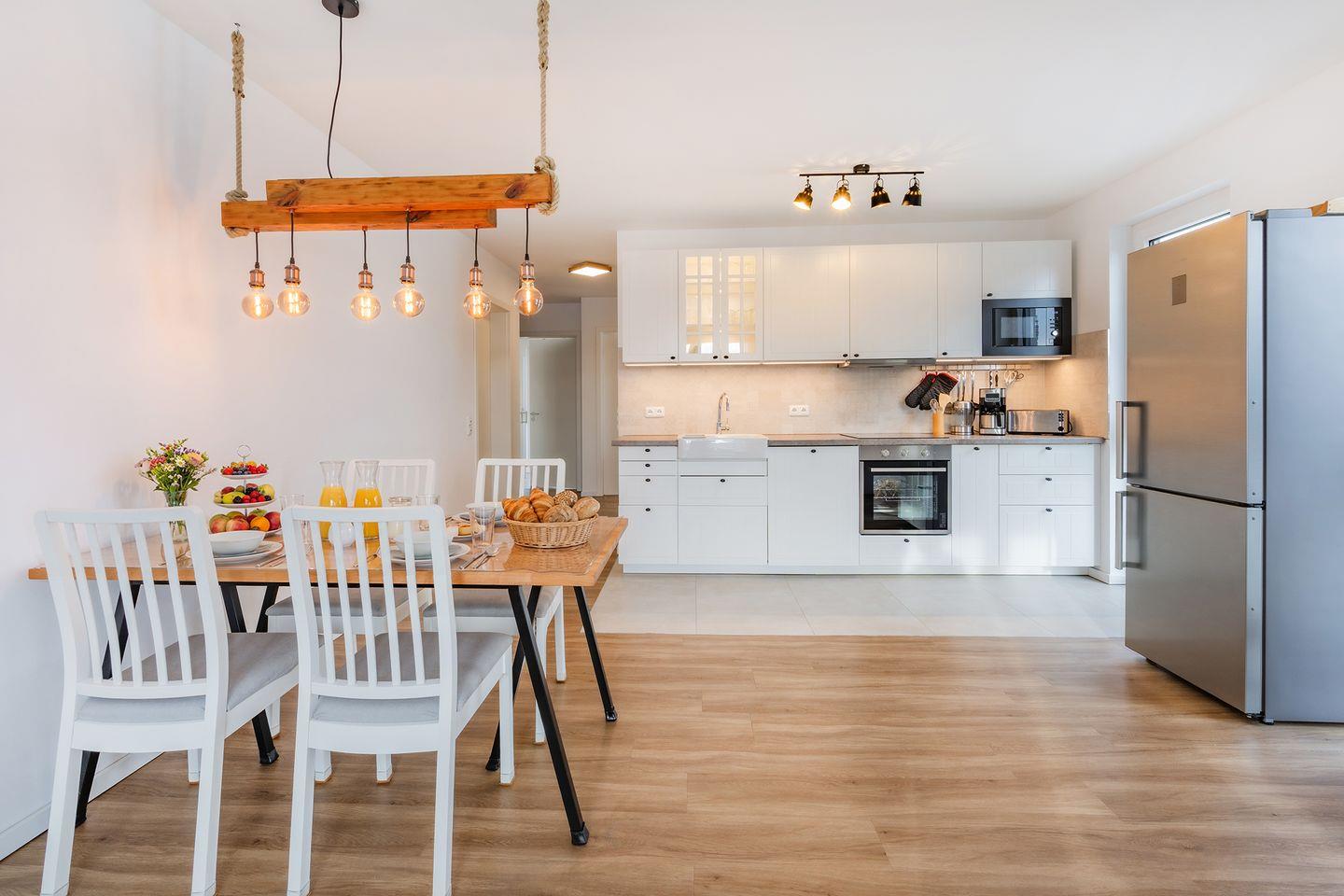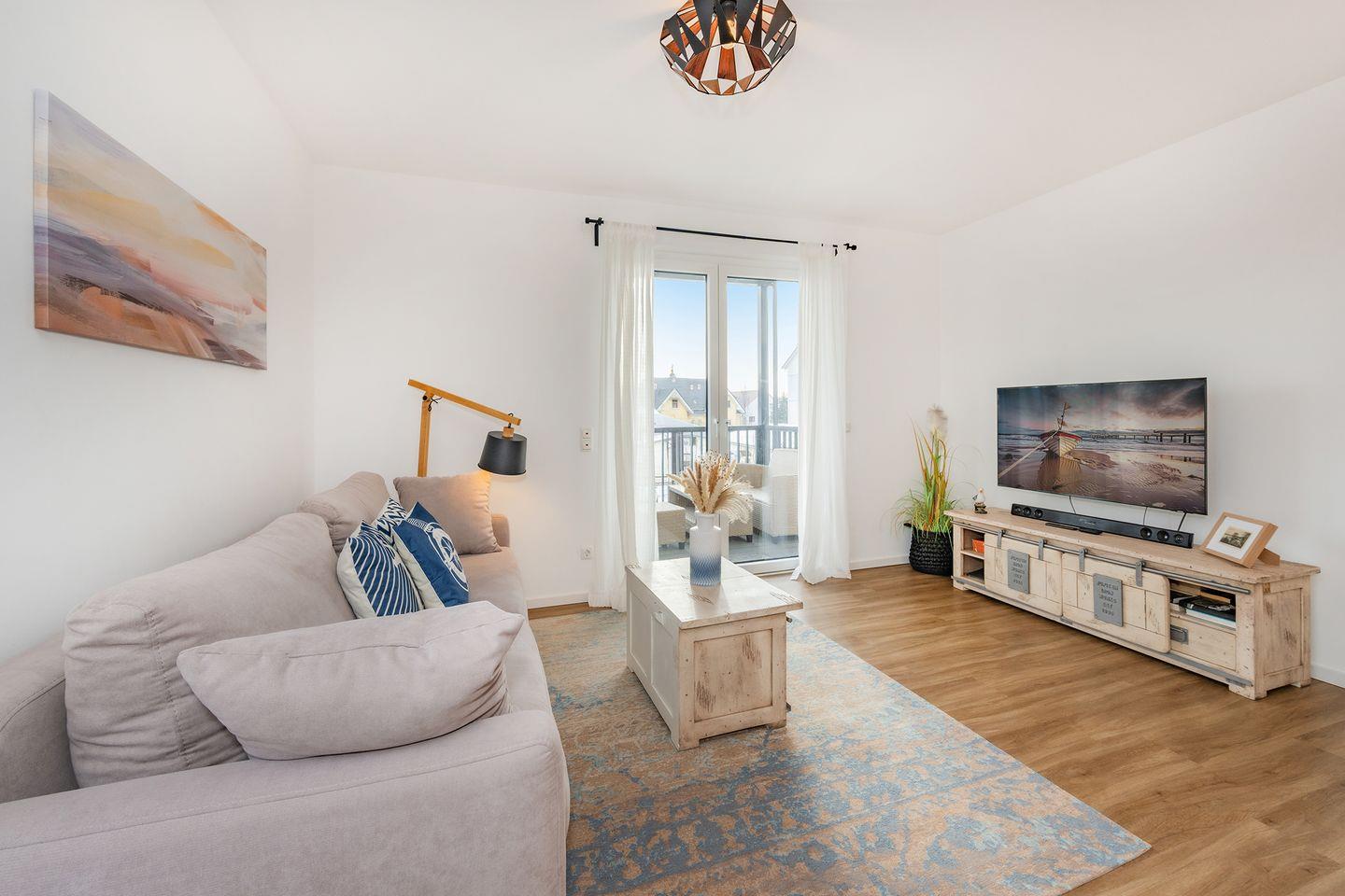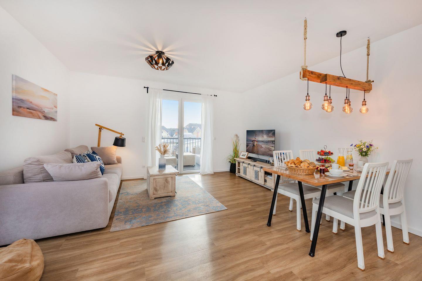 Die 68 Quadratmeter große Ferienwohnung befindet sich im Hochparterre und bietet ein großzügiges Raumgefühl mit durchdachtem Grundriss und eignet sich ideal für Familien oder befreundete Paare. Herzstück ist der helle Wohn- und Essbereich mit offener, moderner Küche. Diese ist komplett ausgestattet mit Backofen, Geschirrspülmaschine, Mikrowelle und Gefrierschrank, sodass Sie sich auch im Urlaub komfortabel selbst versorgen können. Der einladende Essplatz bietet ausreichend Raum für gemeinsame Mahlzeiten, Spieleabende oder gesellige Stunden. Im Wohnbereich sorgt ein Flat-TV für Unterhaltung, Streamingdienste wie Amazon Prime und Netflix sind mit eigenem Account nutzbar. Eine gemütliche Schlafcouch ermöglicht die Aufbettung für eine fünfte und sechste Person, sodass auch größere Familien ausreichend Platz finden. Farblich abgestimmte Möbel und liebevolle Details schaffen eine behagliche Atmosphäre. Der sonnige Balkon ist besonders in den Morgenstunden ein wunderbarer Ort für ein entspanntes Frühstück auf den bequemen Loungemöbeln.